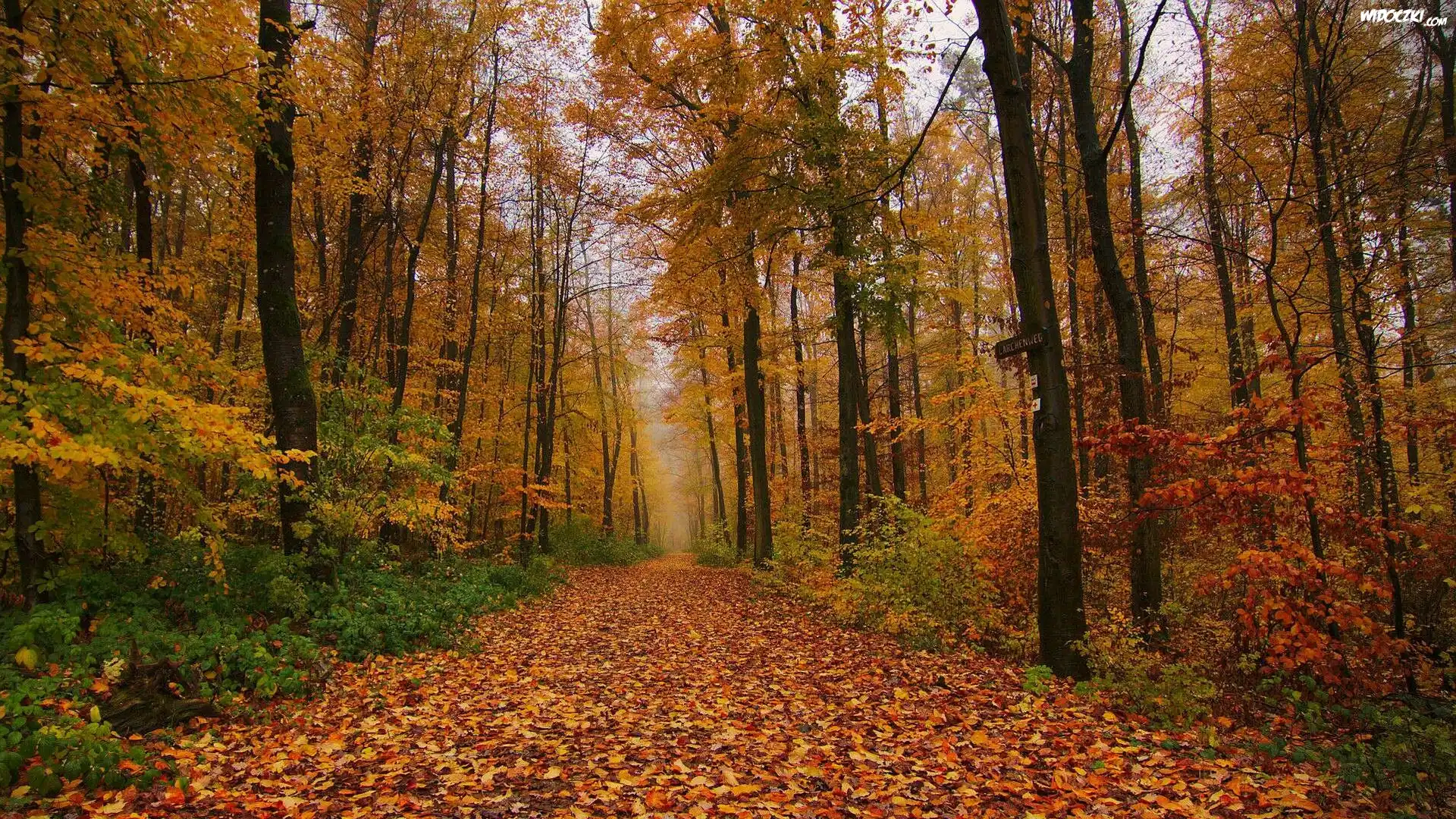 Zdjęcia, Niemcy, Badenia-Wirtembergia, Gmina Niefern-Öschelbronn, Jesień, Las, Drzewa, Droga, Liście