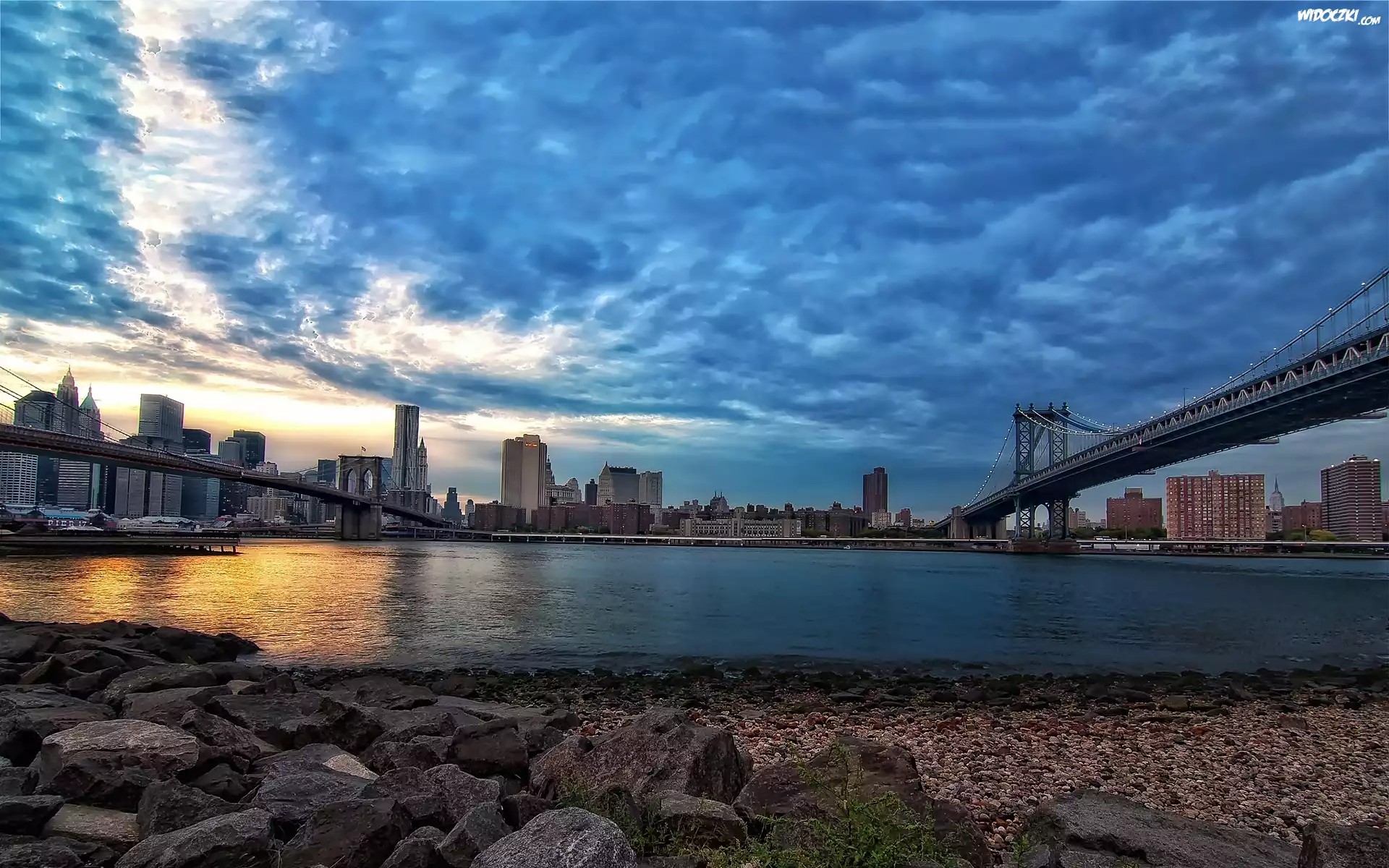 Świt, Chmury, Rzeka, Mosty, Panorama, Nowego, Yorku