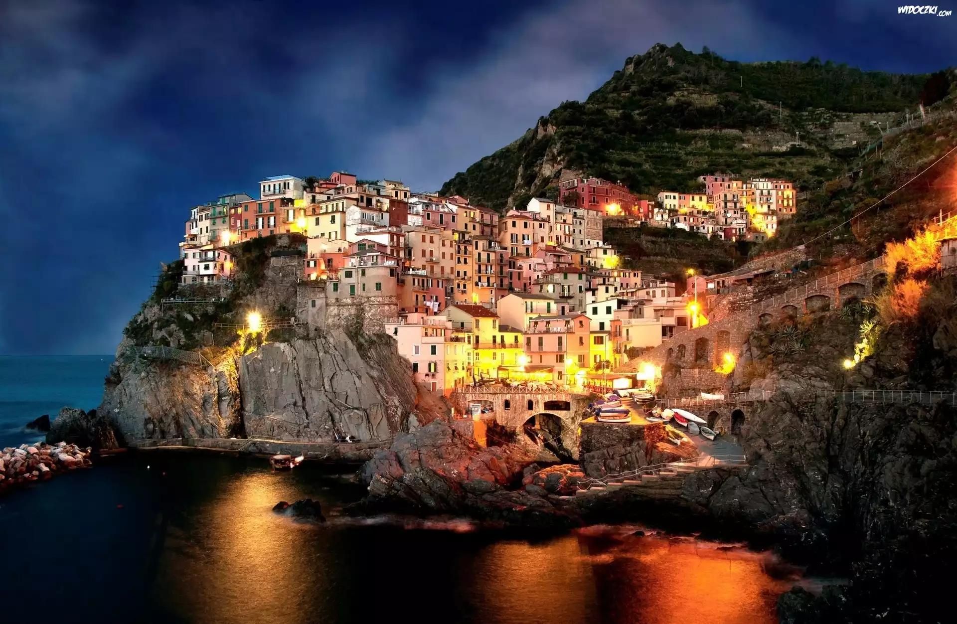 Zdjęcia, Amalfi, Włochy, Wybrzeże, Skały, Domy, Morze, Wieczór