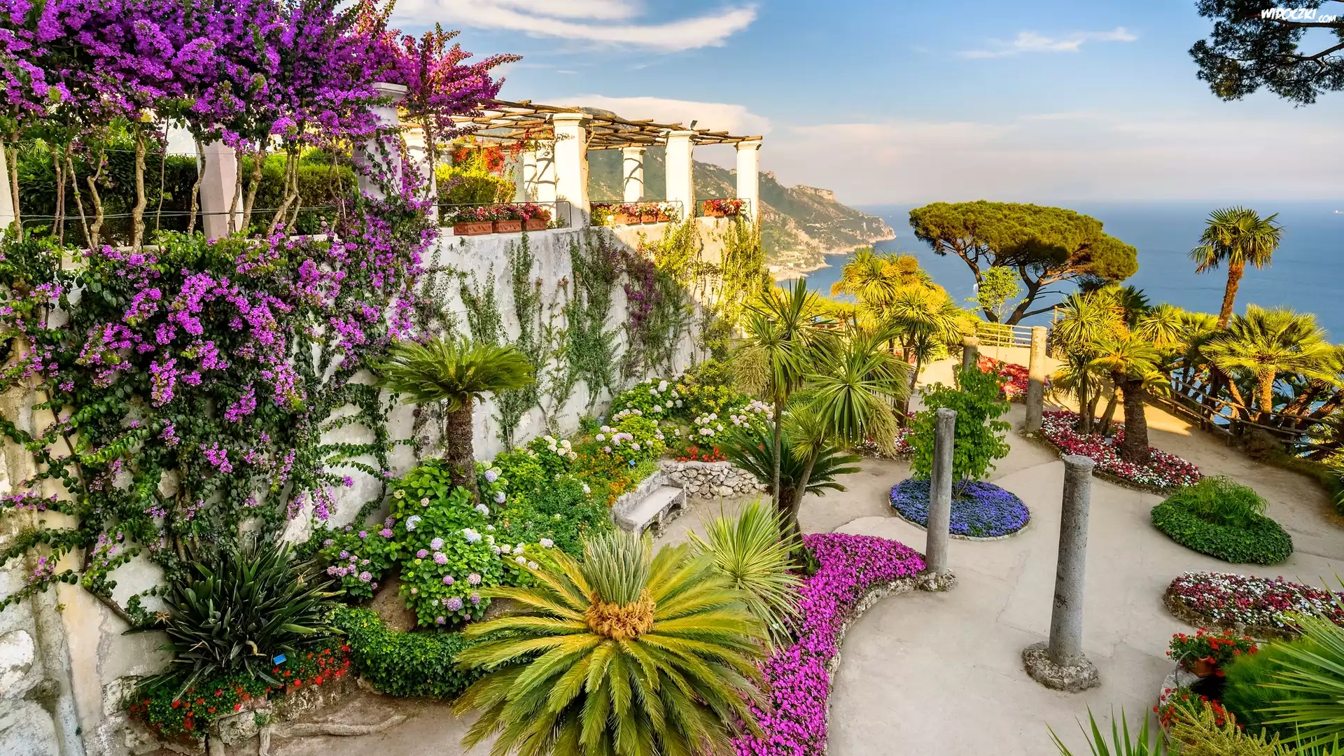 Włochy, Kampania, Wybrzeże Amalfitańskie, Ravello, Morze, Willa Rufolo, Weranda, Ogród, Kwiaty, Drzewa, Roślinność |
