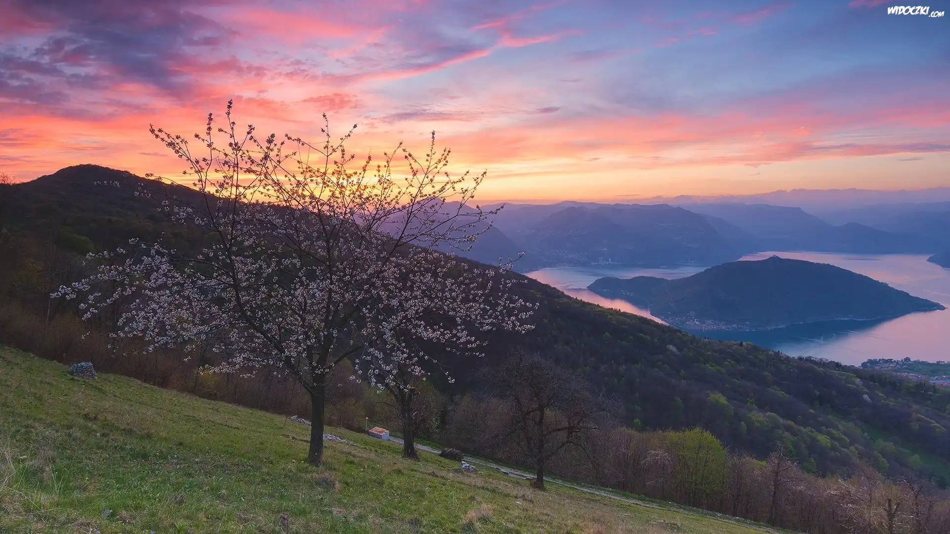 Włochy, Jezioro, Lake Iseo, Góry, Alpy Lombardzkie, Dolina Val Camonica, Drzewa, Domy, Zachód słońca, Chmury, Wiosna |