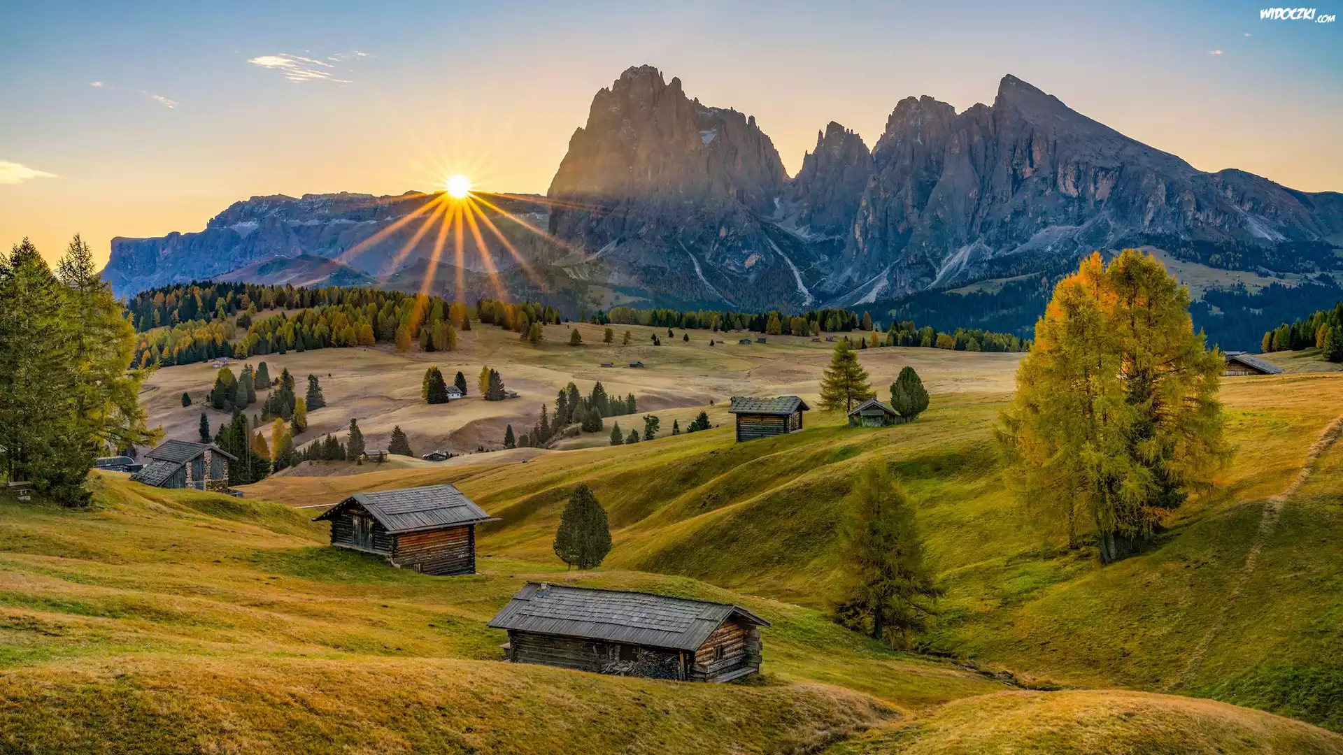 Zdjęcia, Włochy, Południowy Tyrol, Góry, Alpy, Drzewa, Domy, Promienie słońca