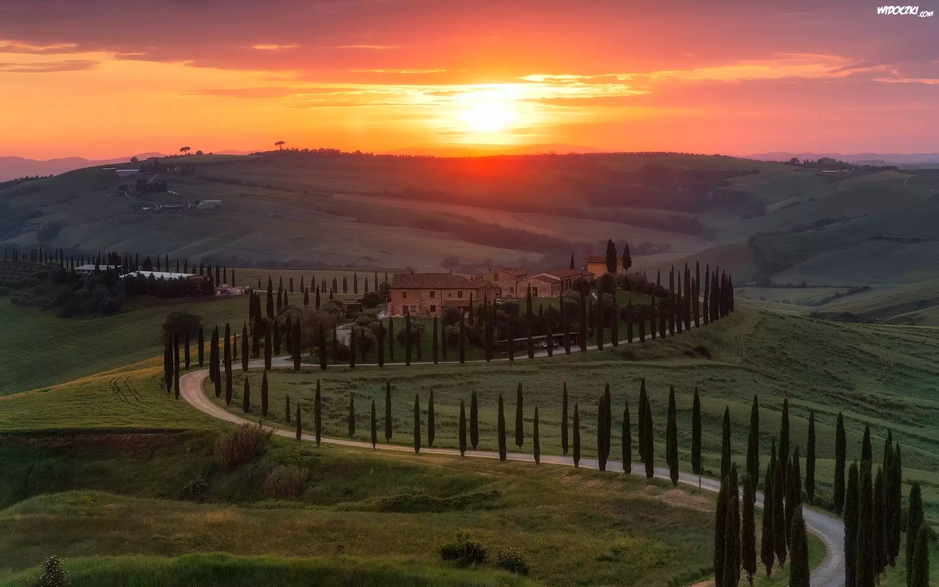 Zdjęcia, Domy, Droga, Drzewa, Cyprysy, Zachód słońca, Wzgórza, Toskania, Włochy