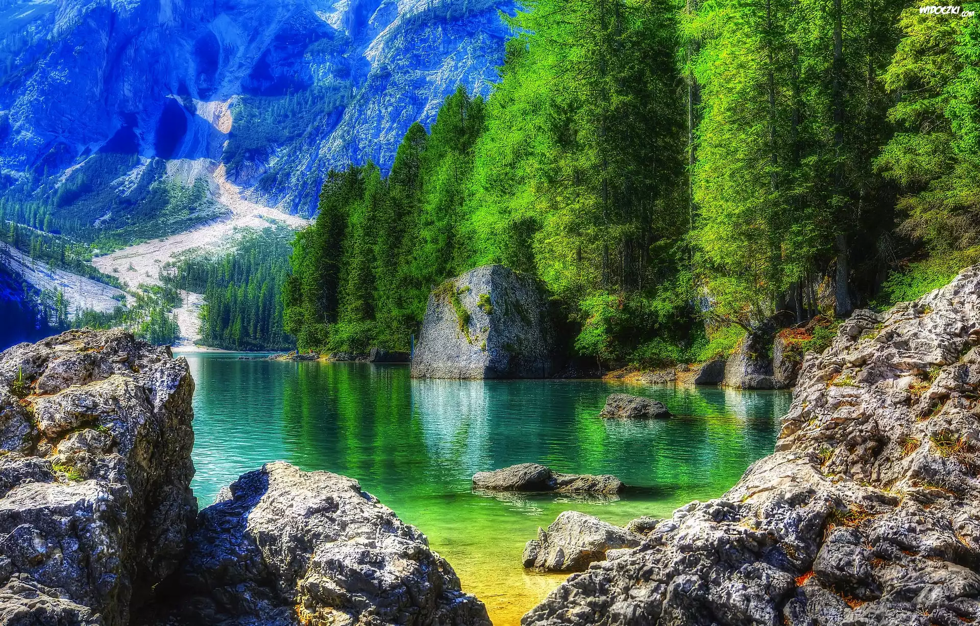 Włochy, Region Trydent-Górna Adyga, Jezioro Braies - Pragser Wildsee, Skały, Jezioro, Góry, Lasy |