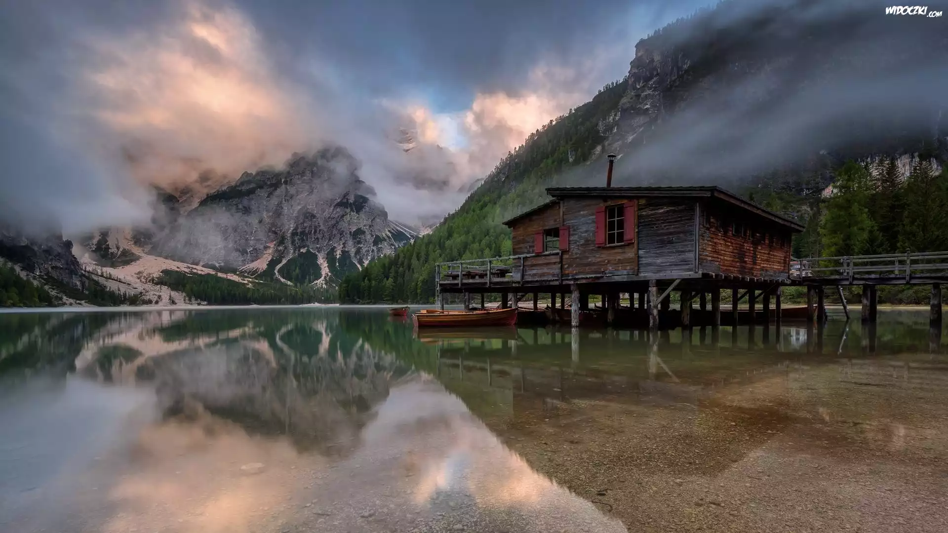 Włochy, Południowy Tyrol, Jezioro, Pragser Wildsee, Lago di Braies, Góry, Dolomity, Pomost, Drewniany, Domek, Łódki, Chmury, Mgła |