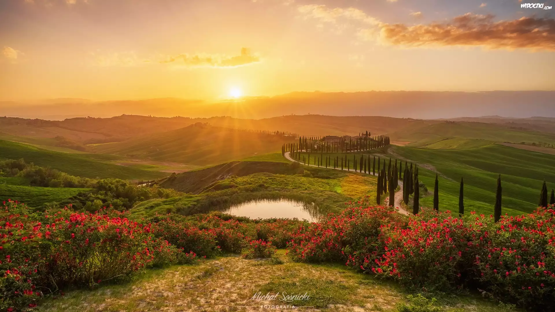 Zdjęcia, Włochy, Toskania, Baccoleno, Wzgórza, Droga, Aleja, Cyprysy, Słońce, Jezioro, Kwiaty