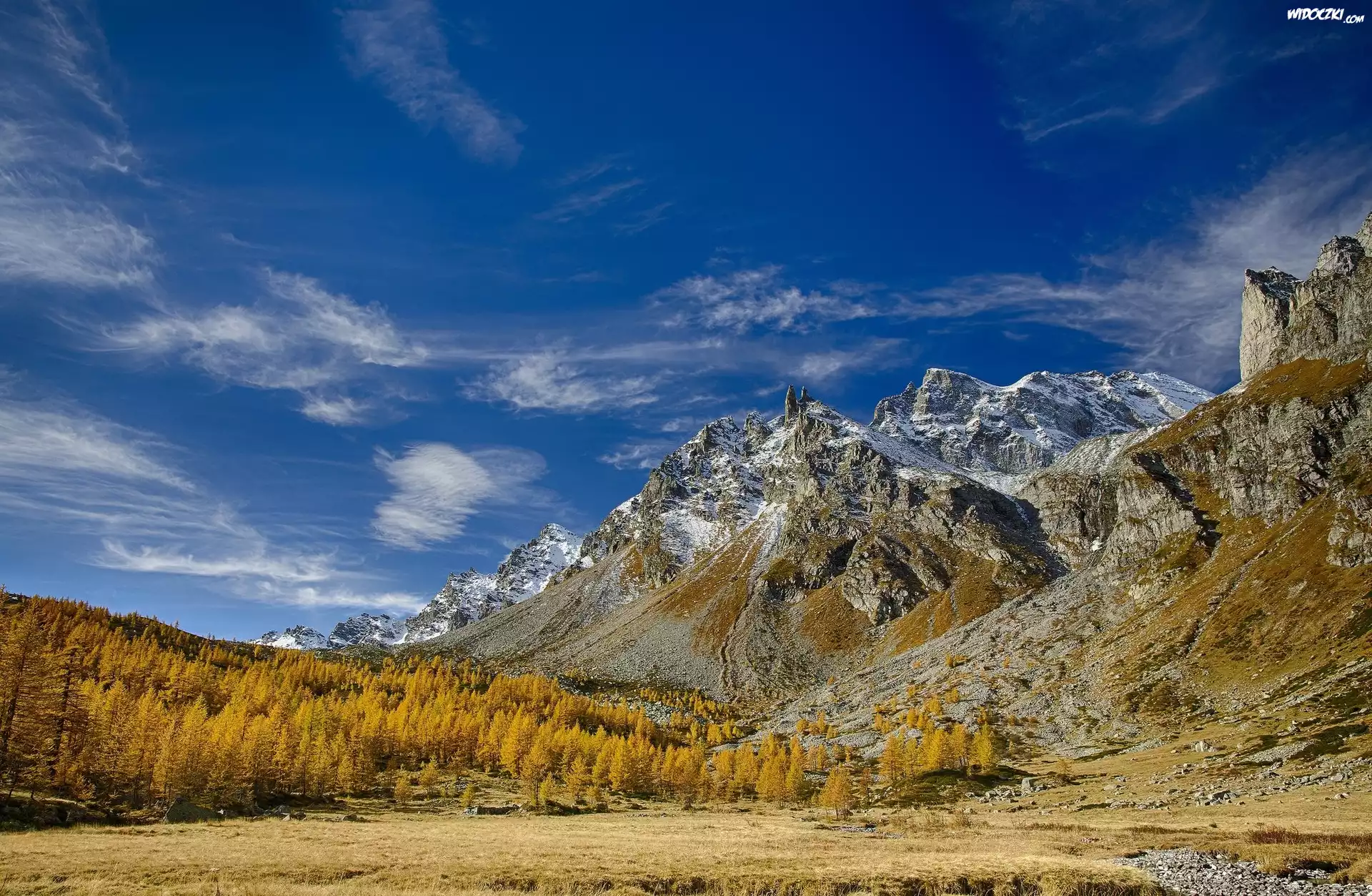 Włochy, Region Piemont, Góry Alpy, Dolina Val Buscagna, Ośrodek narciarski Alpe Devero, Jesień, Niebo, Las, Drzewa |