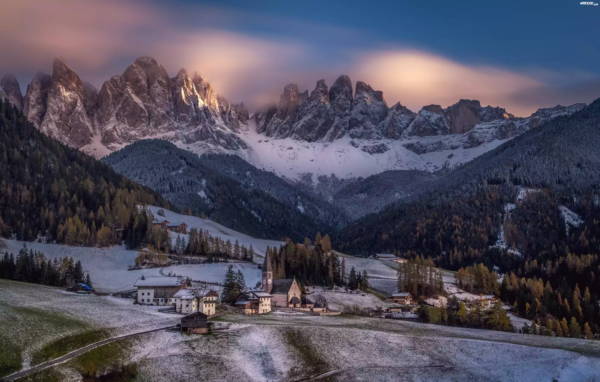 Zdjęcia, Włochy, Dolomity, Santa Maddalena, Góry, Alpy, Kościół, Domy, Las, Zima