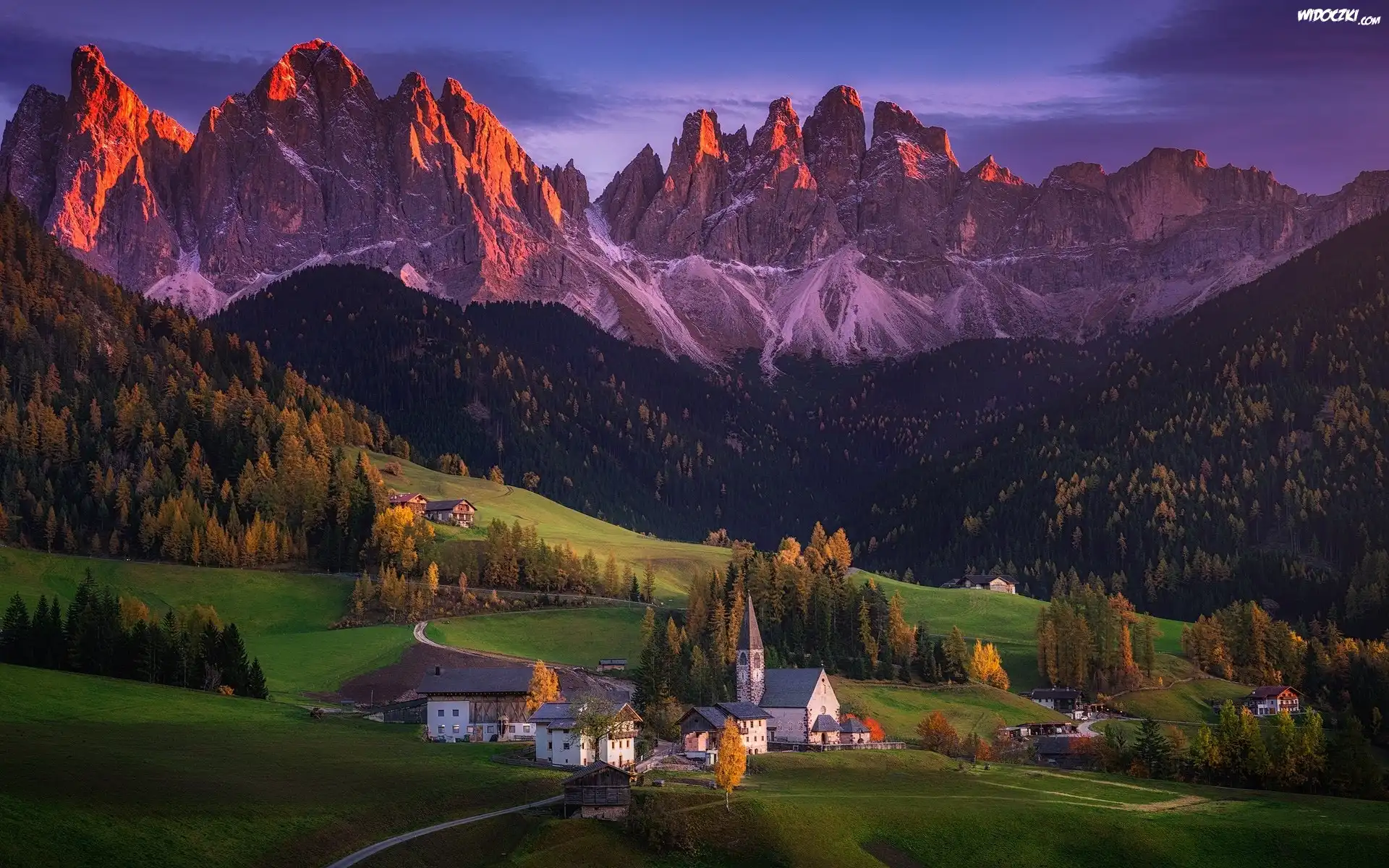 Włochy, Dolomity, Dolina Val di Funes, Wieś Santa Maddalena, Domy, Kościół, Góry, Masyw Odle, Lasy, Drzewa |