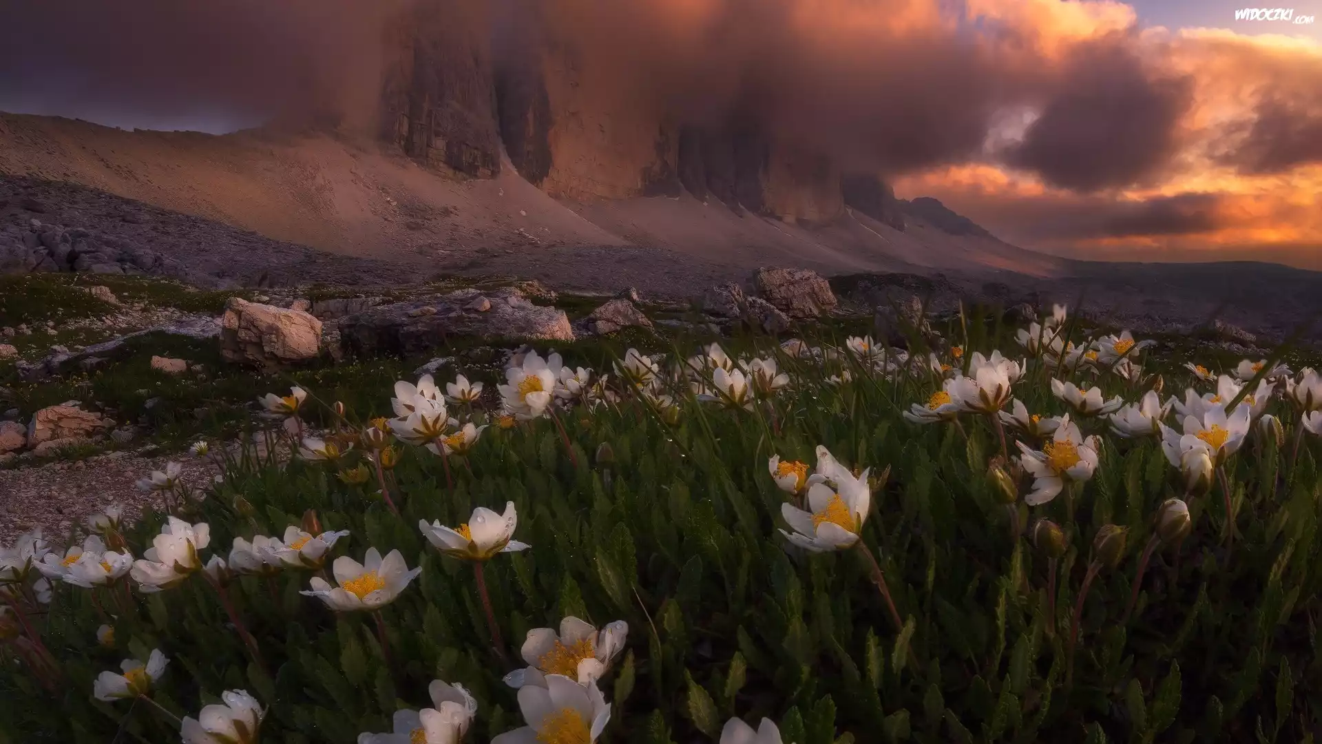 Zdjęcia, Włochy, Dolomity, Góry, Masyw Tre Cime di Lavaredo, Ciemne, Chmury, Białe, Kwiaty, Łąka
