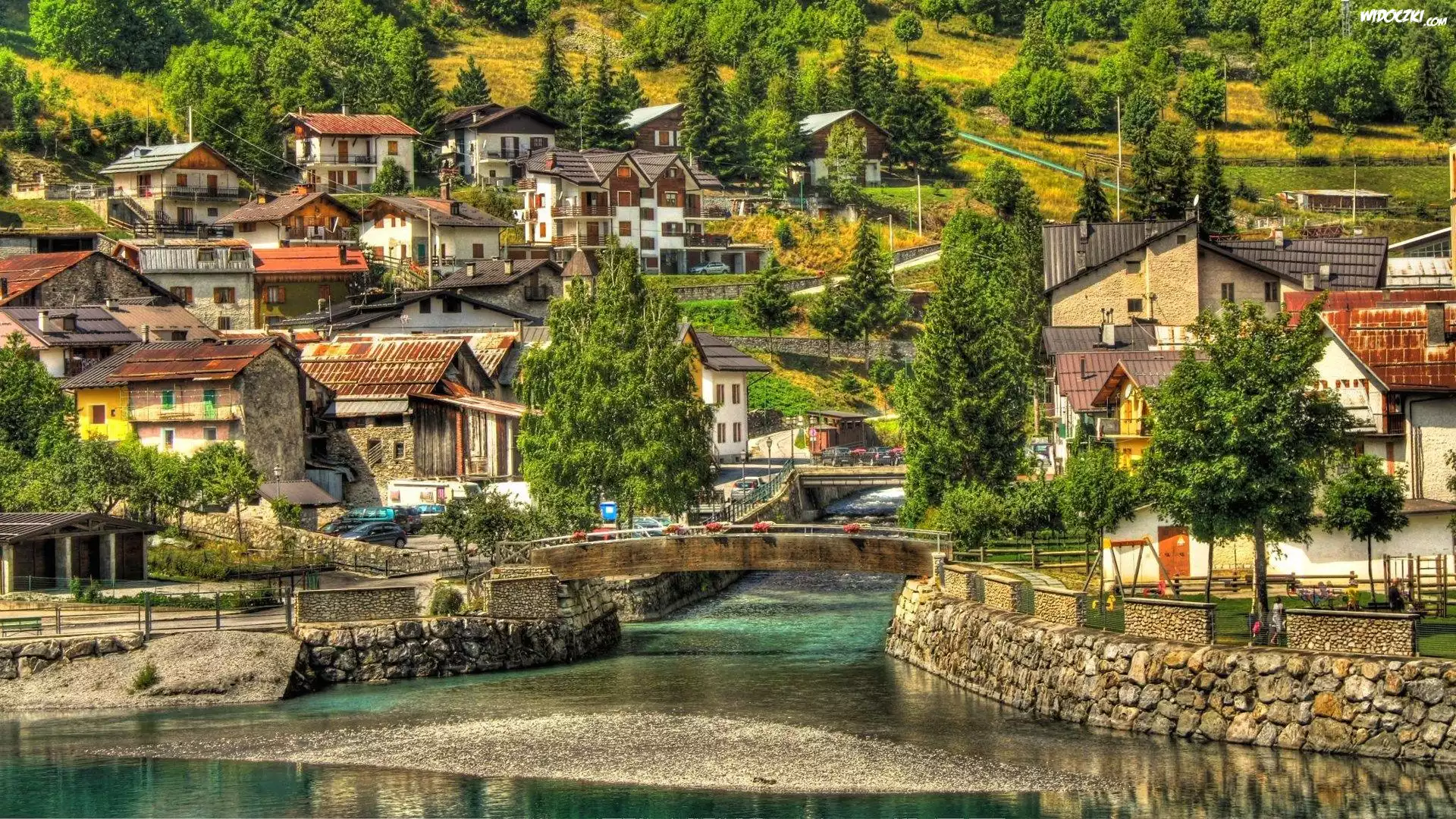 Włochy, Pietraporzio, Miasteczko, Rzeka, Mostek, Drzewa
