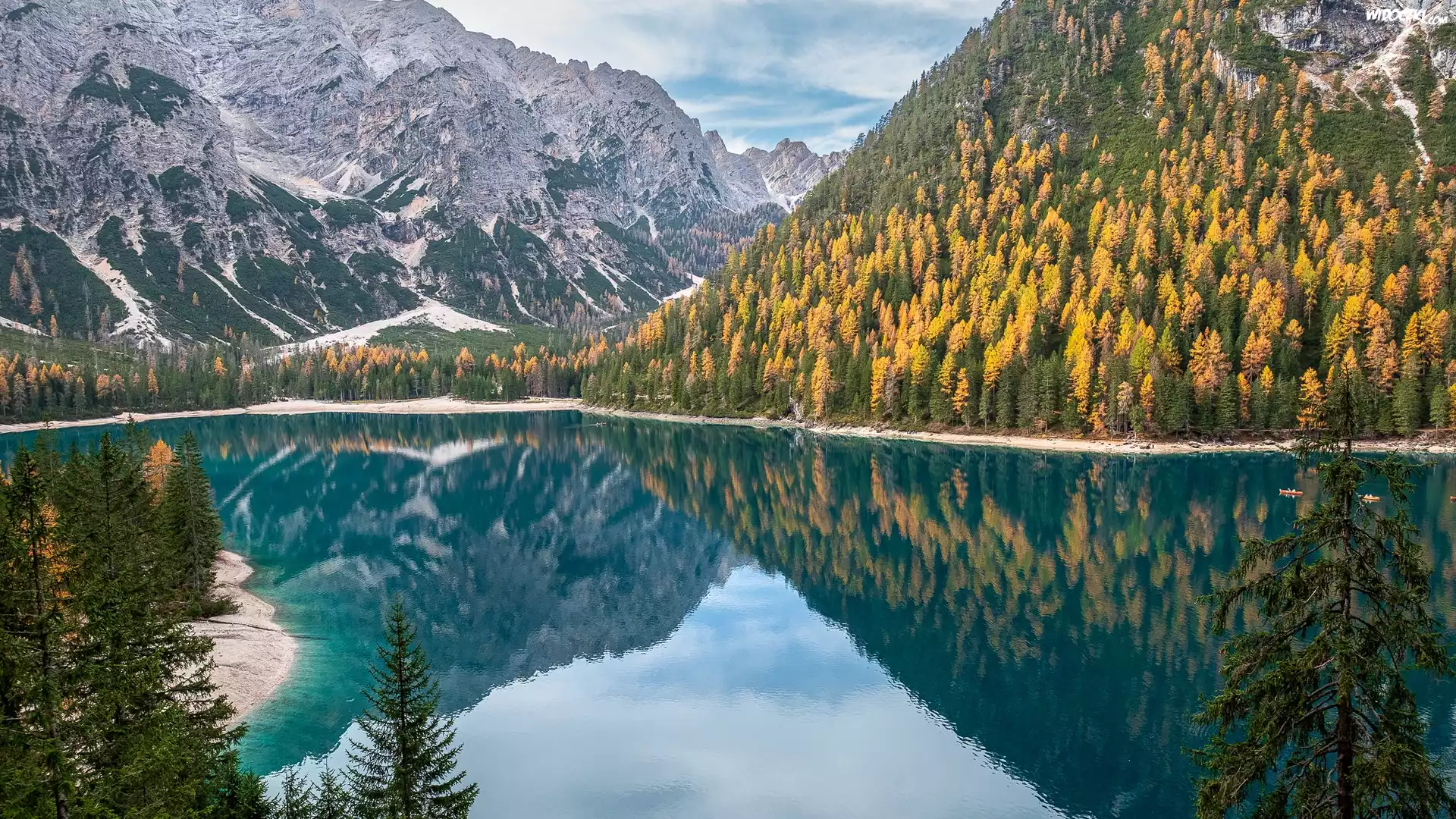 Góry, Jezioro, Pragser Wildsee, Żółte, Drzewa, Odbicie, Włochy