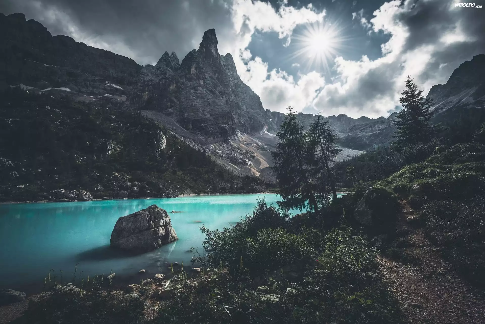 Włochy, Dolomity, Region Veneto, Gmina Cortina dAmpezzo, Jezioro Sorapiss, Góra Sorapiss, Góry, Drzewa, Kamienie, Promienie słońca |