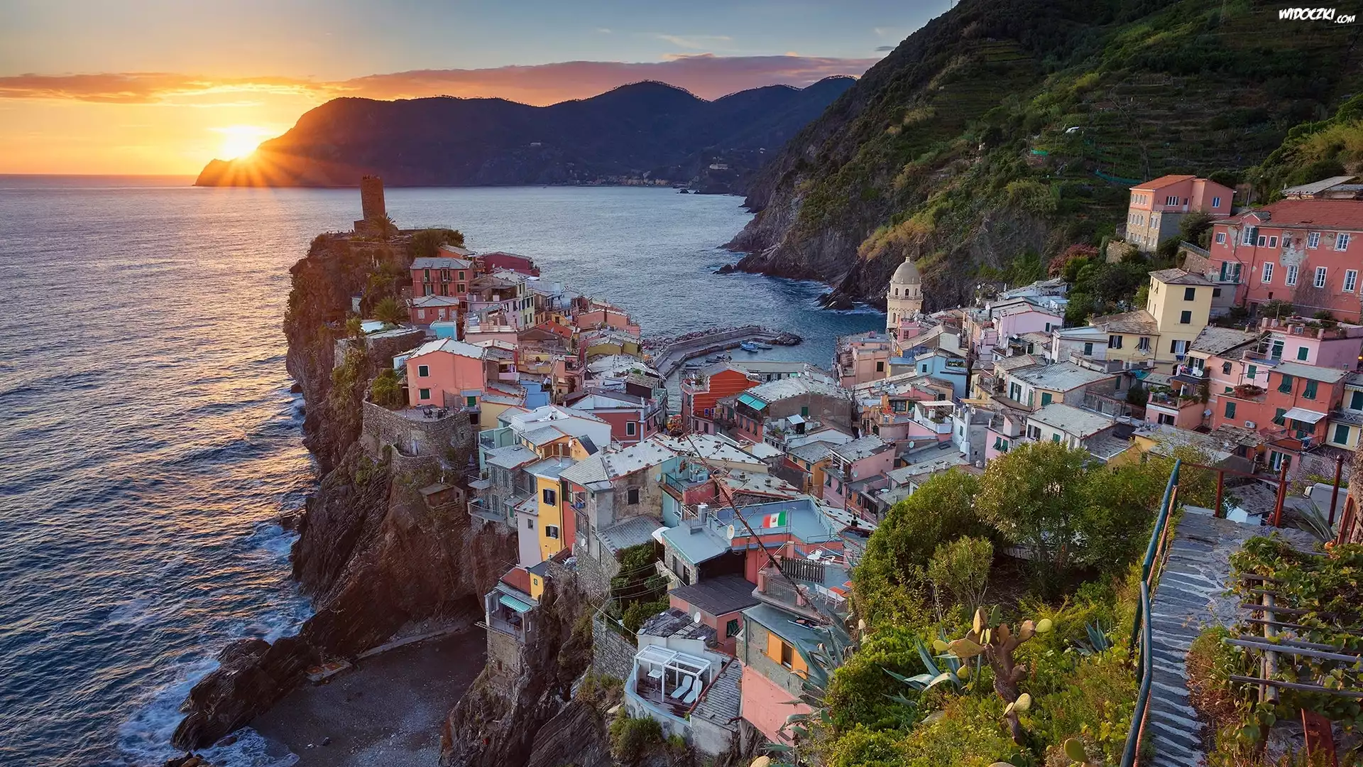Włochy, Prowincja La Spezia, Miejscowość Vernazza, Morze Liguryjskie, Riviera di Levante, Morze, Zatoka, Skały, Domy, Wschód słońca, Wzgórza |