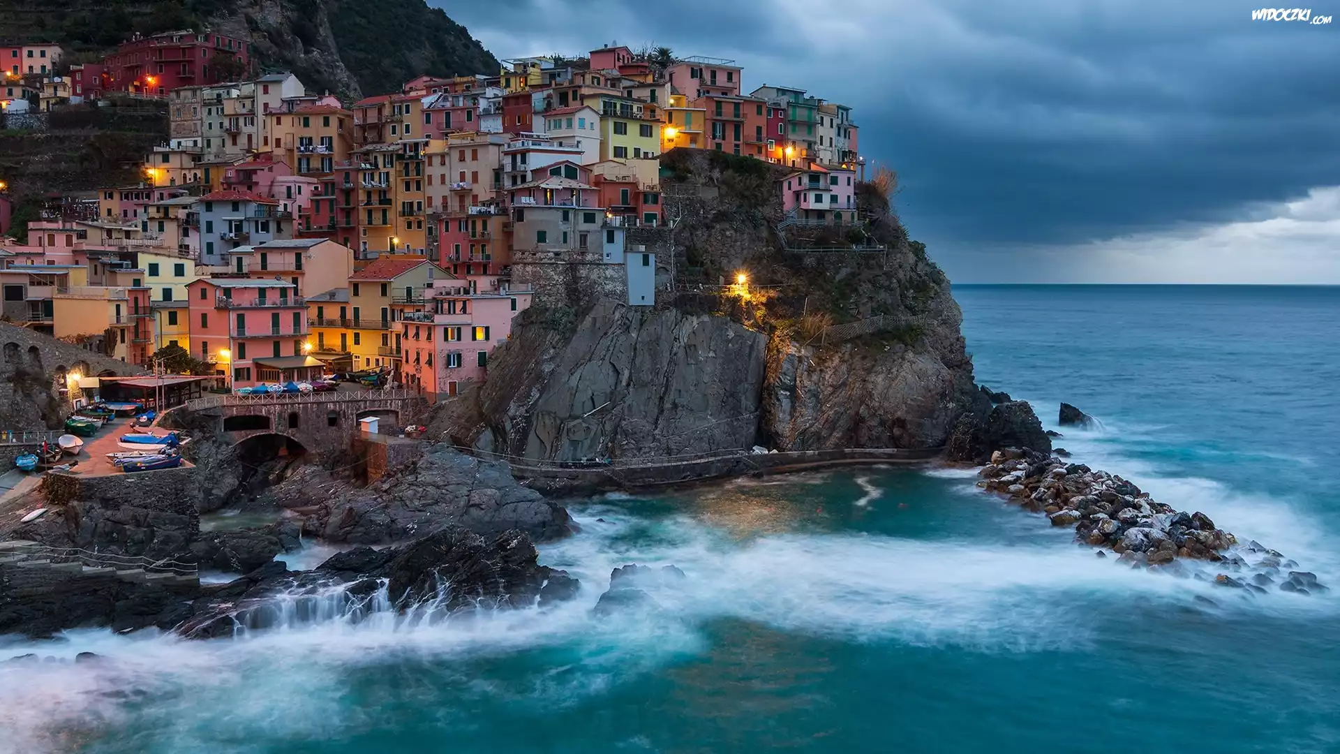 Włochy, Prowincja La Spezia, Region Liguria, Gmina Riomaggiore, Miejscowość Manarola, Morze Liguryjskie, Kolorowe, Domy, Światła, Skały, Zatoczka, Chmury |