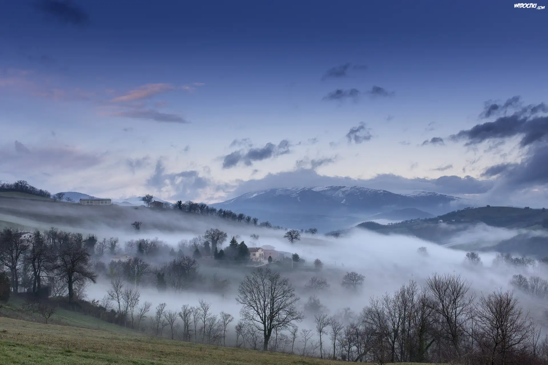 Zdjęcia, Włochy, Mgła, Góry Sibillini, Drzewa