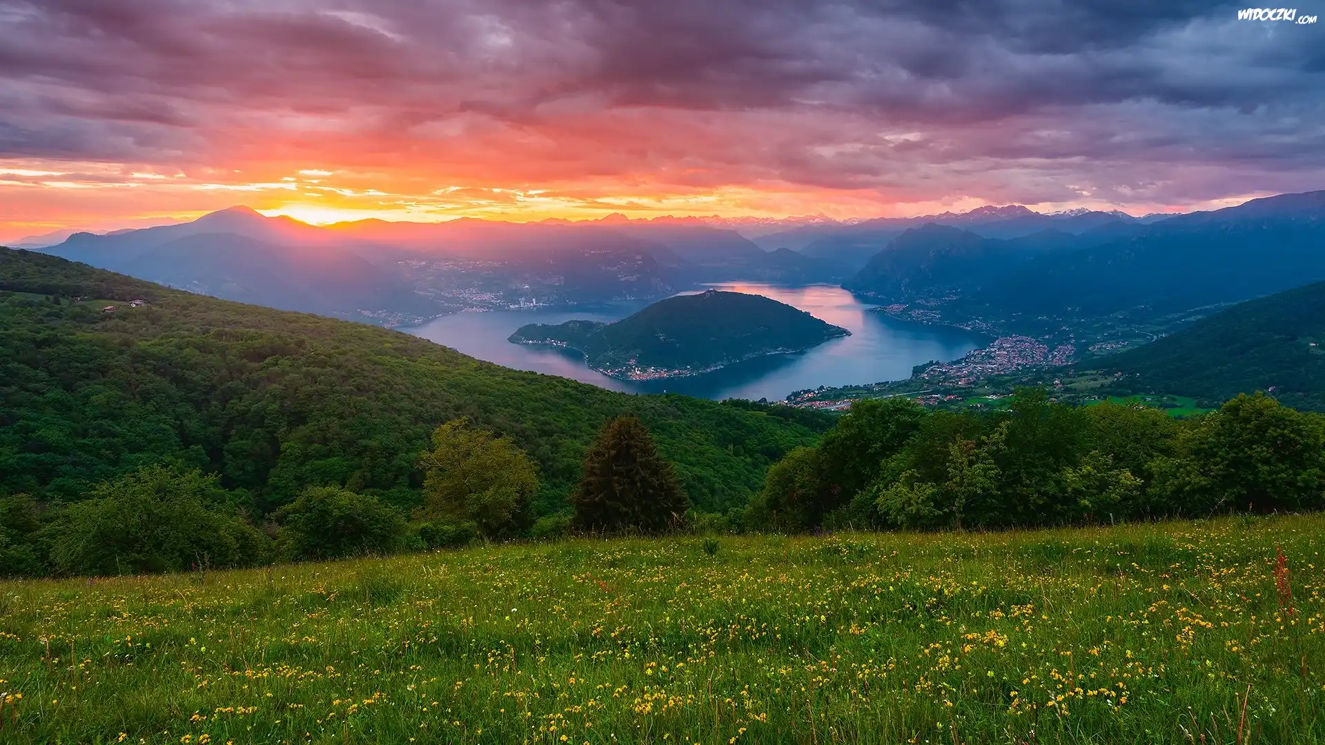 Włochy, Jezioro, Lake Iseo, Góry, Alpy Lombardzkie, Dolina Val Camonica, Las, Drzewa, Domy, Zachód słońca, Chmury |