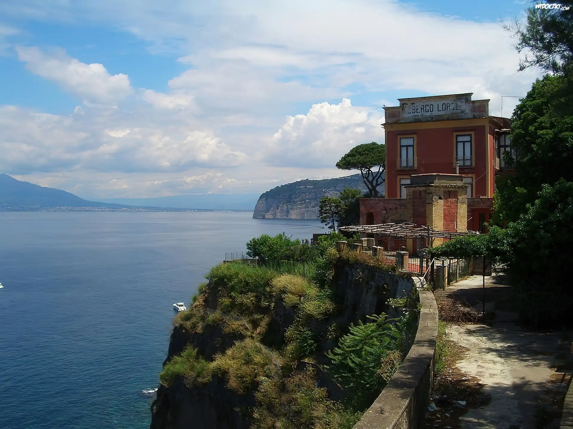 Zdjęcia, Sorrento, Włochy, Woda, Dom, Murek, Drzewa, Krzaki