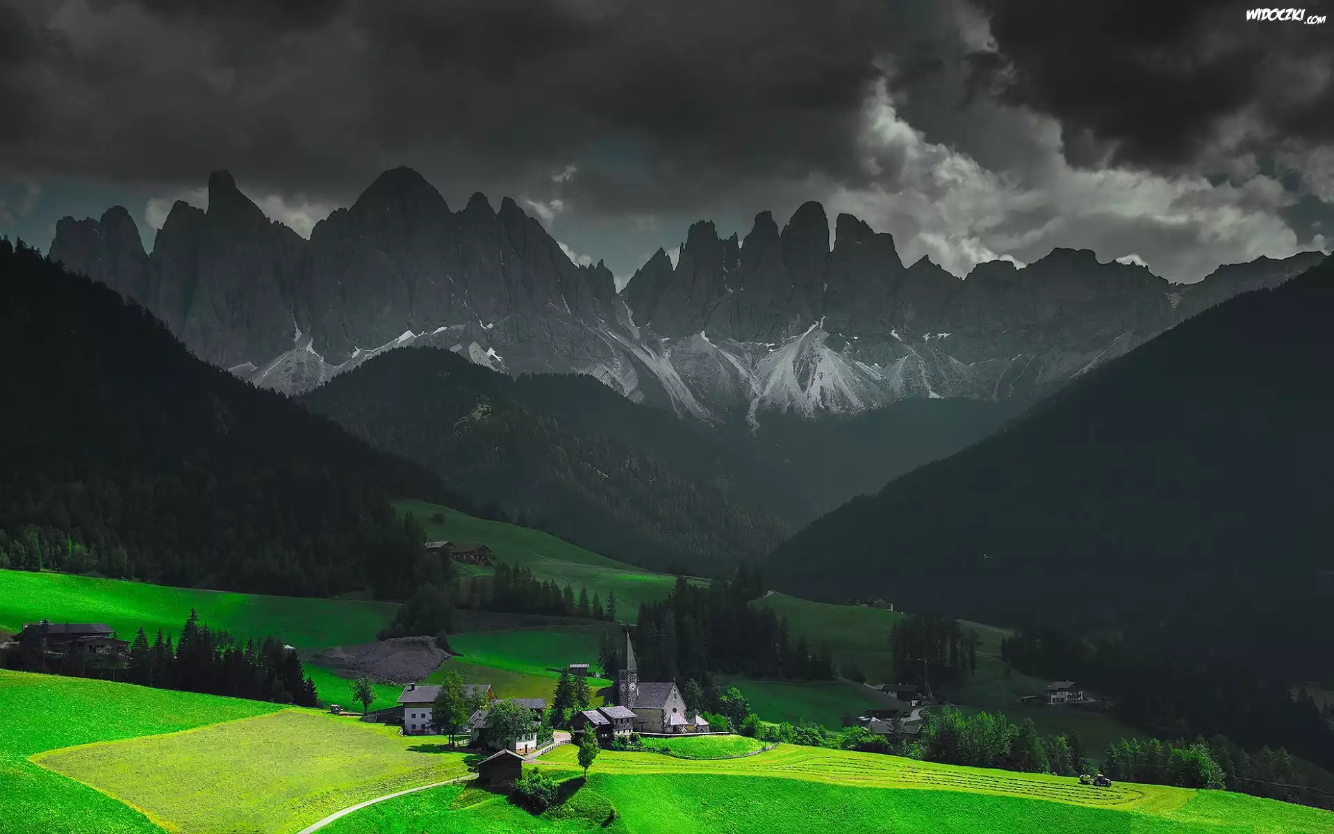 Zdjęcia, Włochy, Dolomity, Dolina Val di Funes, Domy, Kościół, Góry, Masyw Odle, Ciemne, Chmury