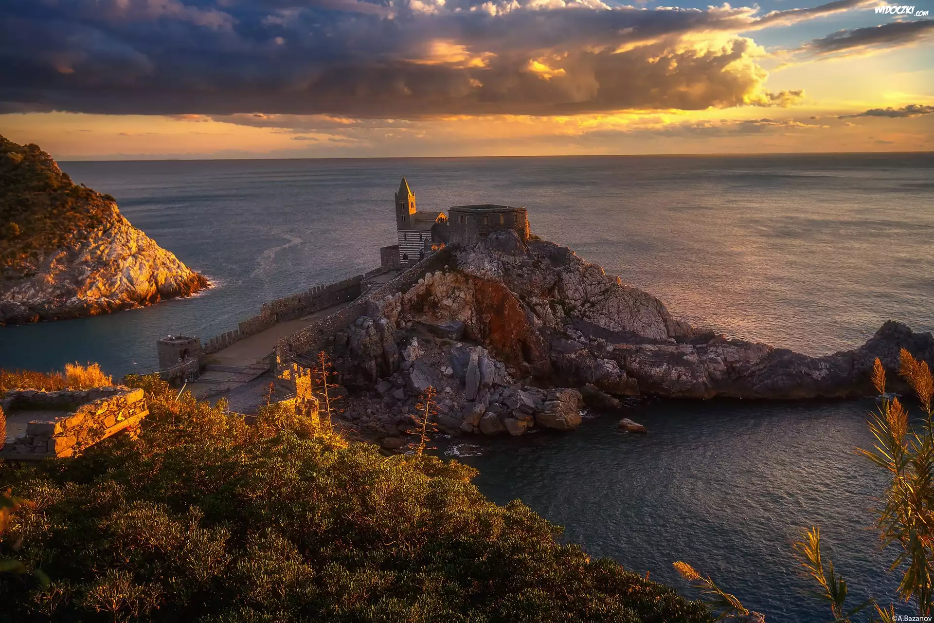 Włochy, Region Liguria, Miasteczko Portovenere, Chiesa di San Pietro - kościół św. Piotra, Morze Liguryjskie, Wybrzeże, Skały |