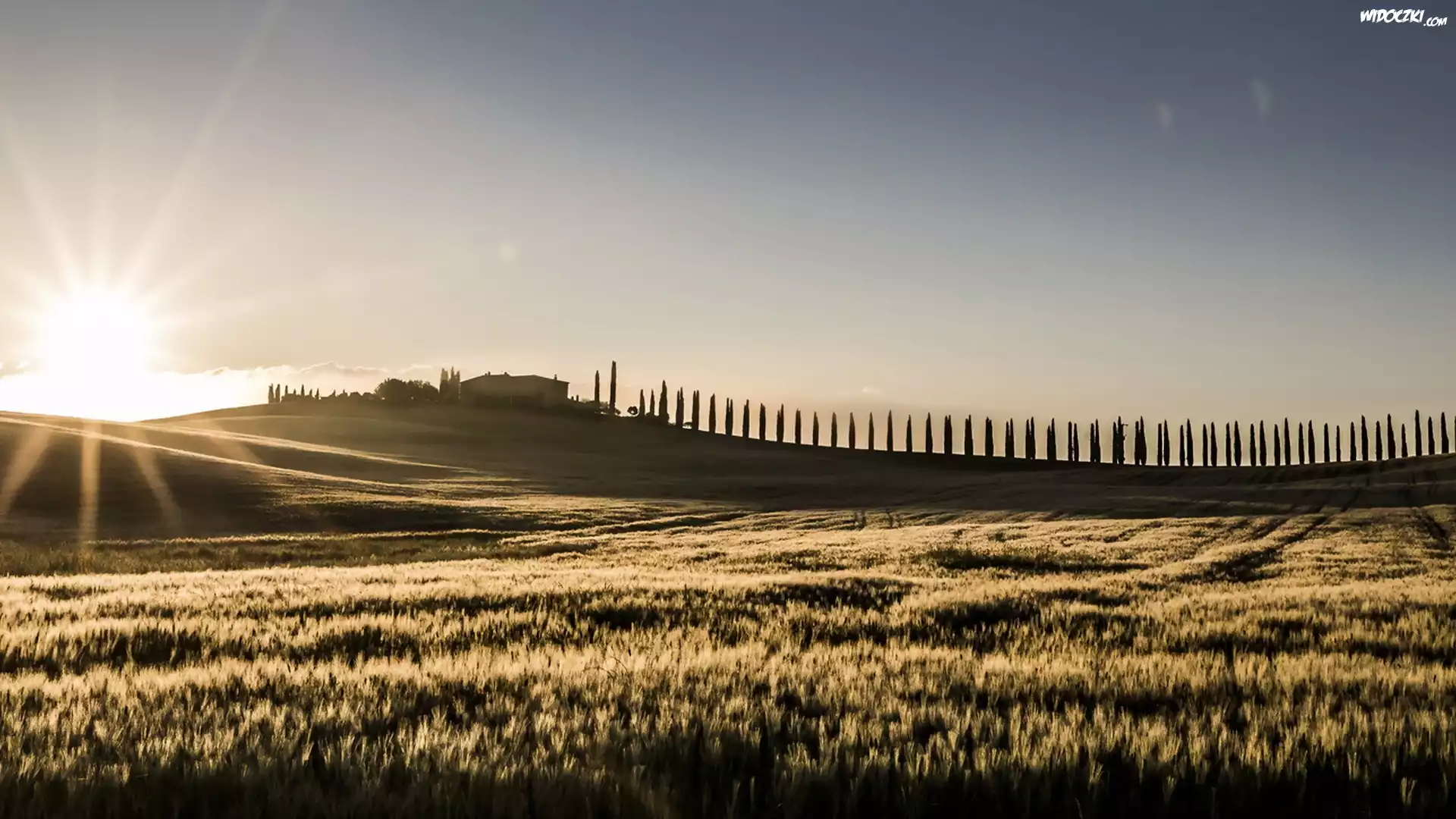 Zdjęcia, Łąki, Wzgórze, Dom, Drzewa, Promienie, Słońca, Toskania, Włochy