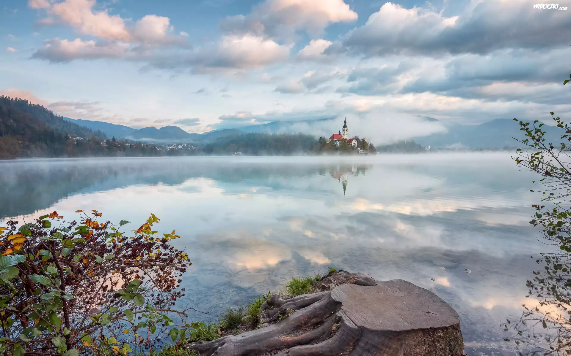 Słowenia, Góry, Wyspa Blejski Otok, Jezioro Bled, Kościół Wniebowzięcia Marii Panny, Mgła, Chmury, Odbicie |