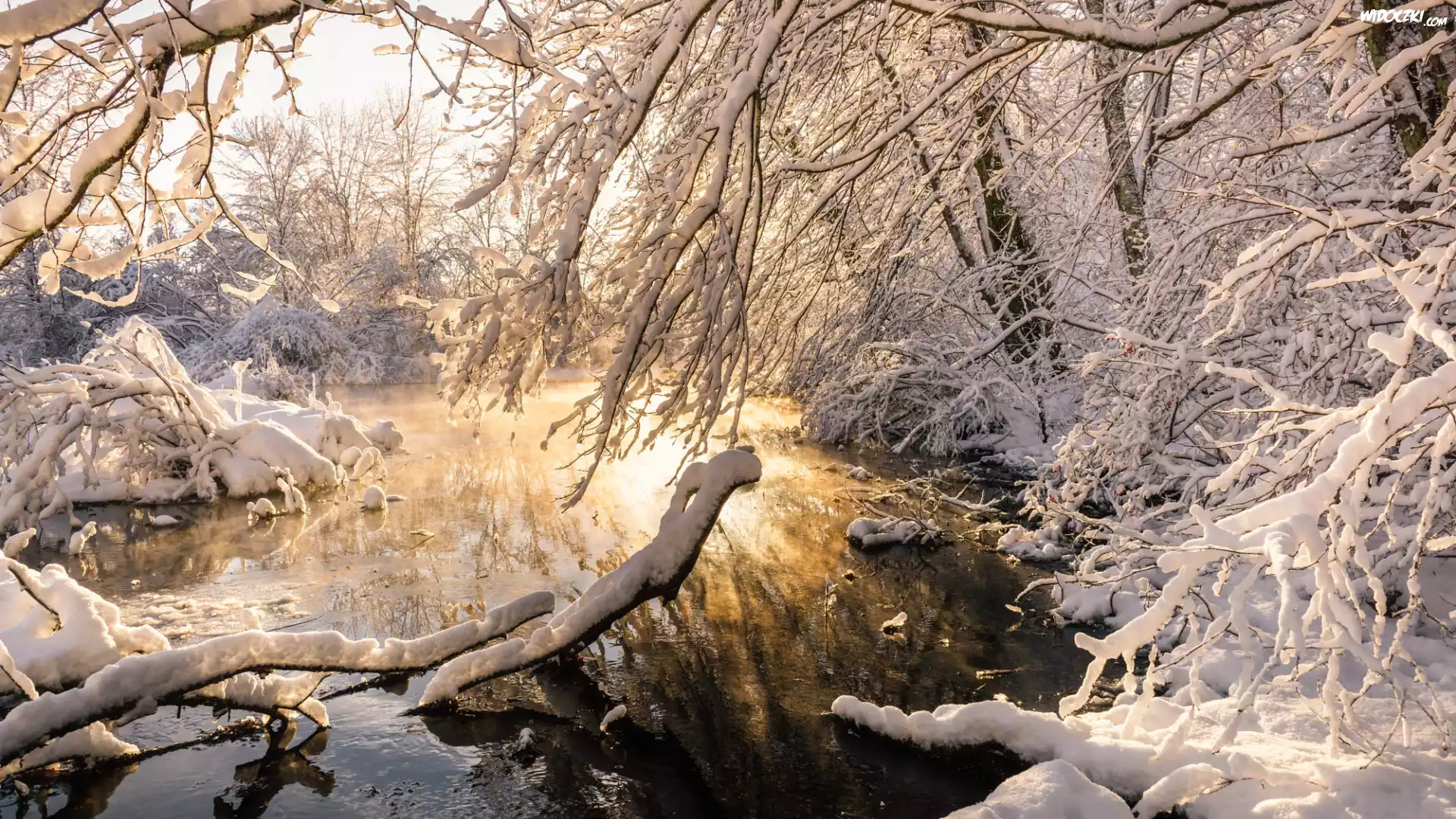 Zdjęcia, Zima, Drzewa, Gałęzie, Woda, Słoneczny, Blask