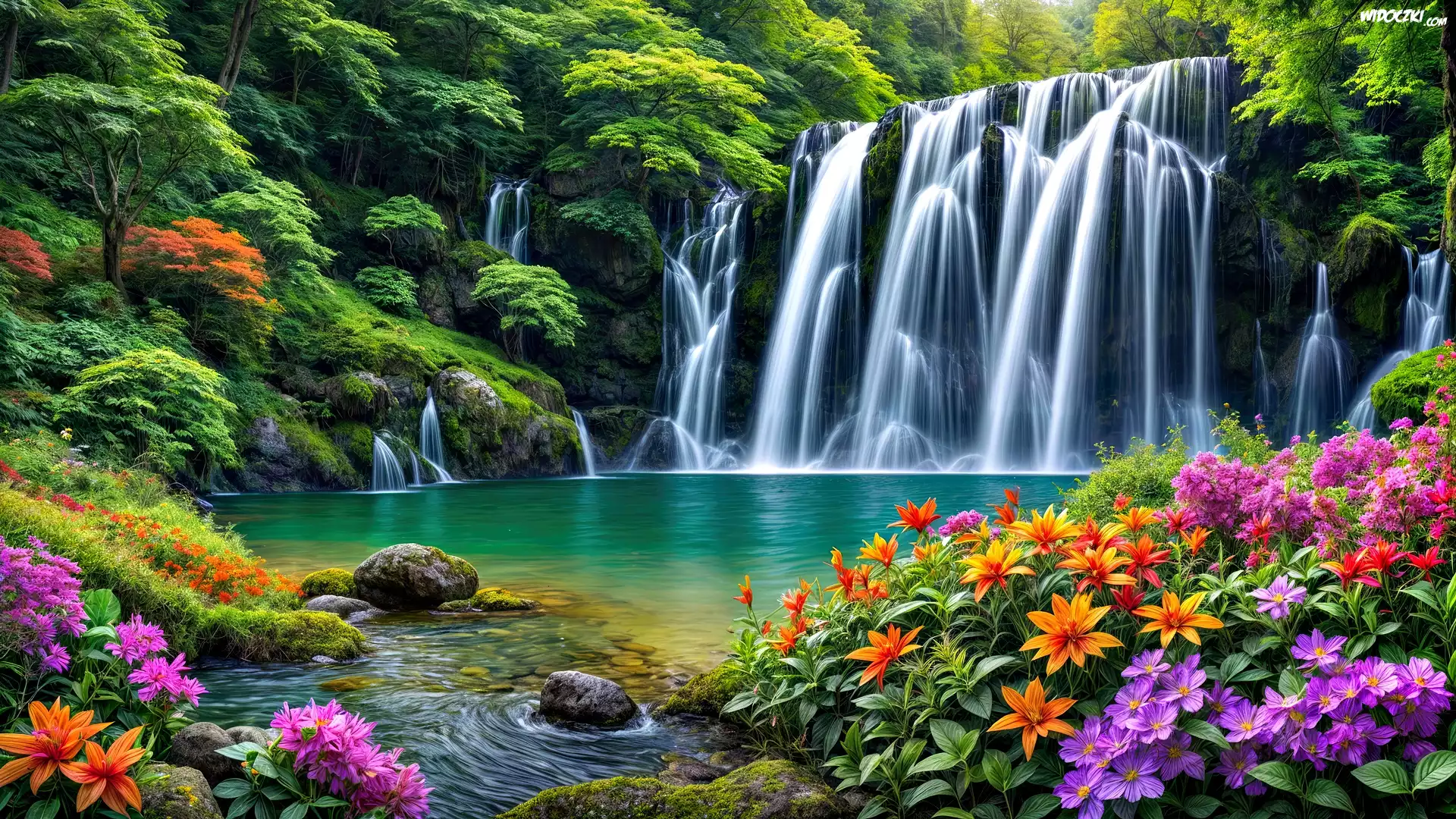 Zdjęcia, Kwiaty, Woda, Las, Wodospad, Grafika