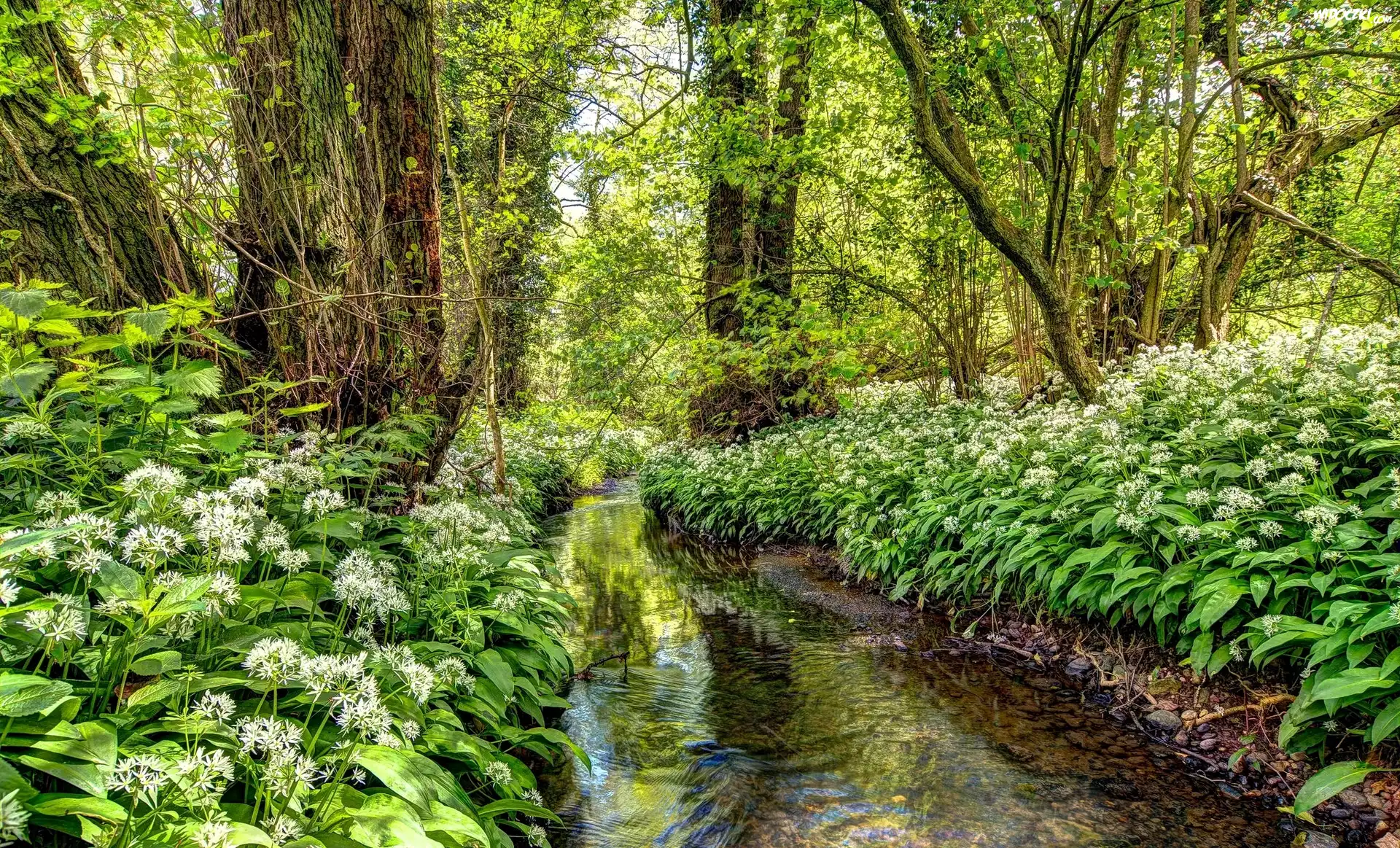 Las, Woda, Polne, Białe, Kwiaty, Czosnek niedźwiedzi