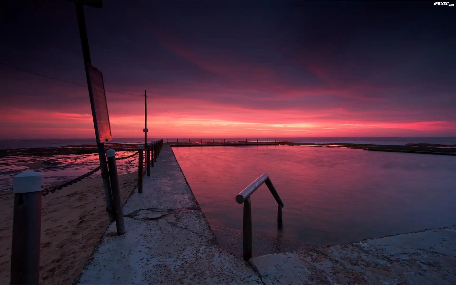 Most, Woda, Niebo, Chmury, Zima, Zachód słońca