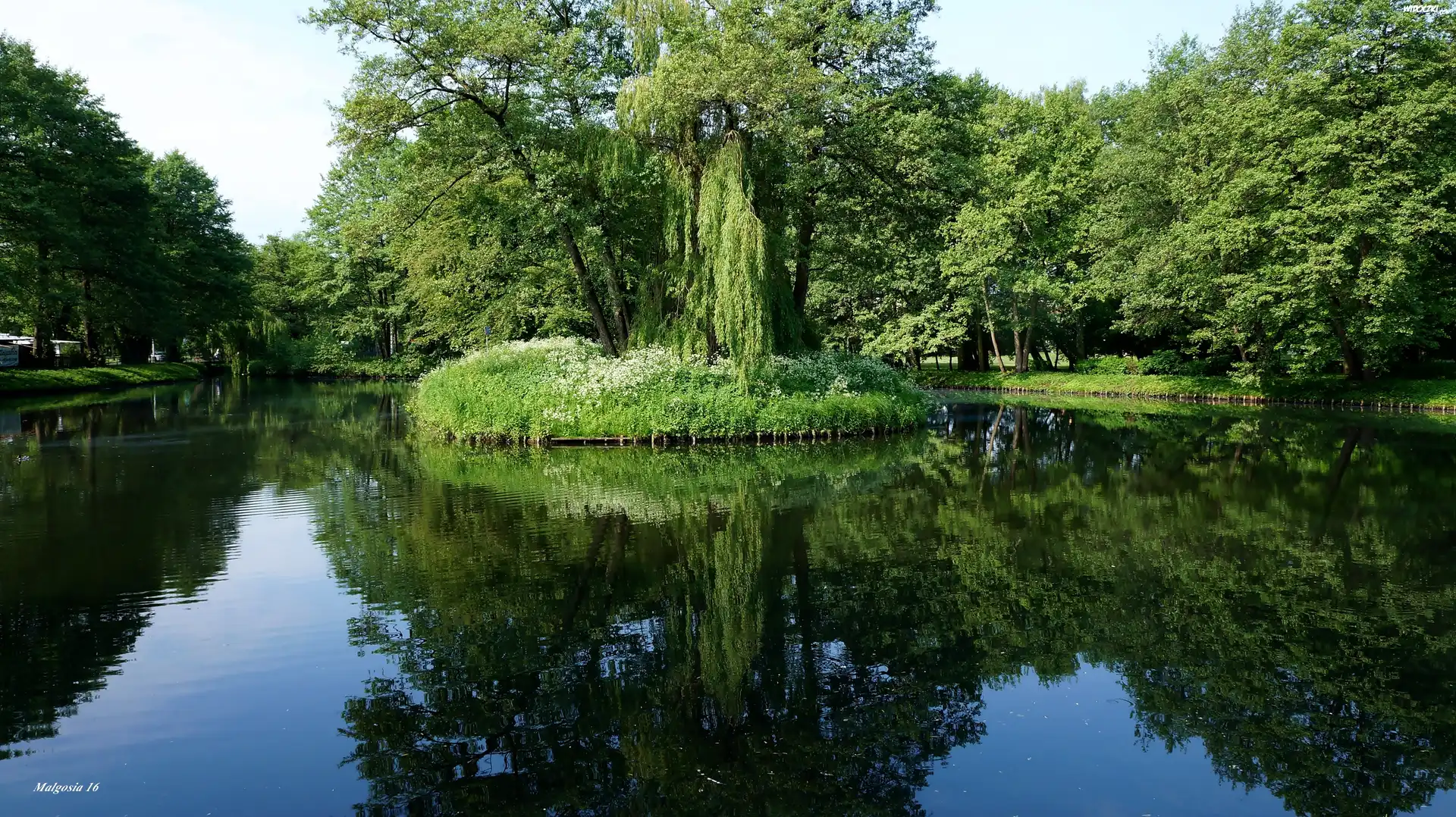 Zdjęcia, Park, Woda, Jeziorko, Wysepka, Drzewa, Zieleń, Odbicie