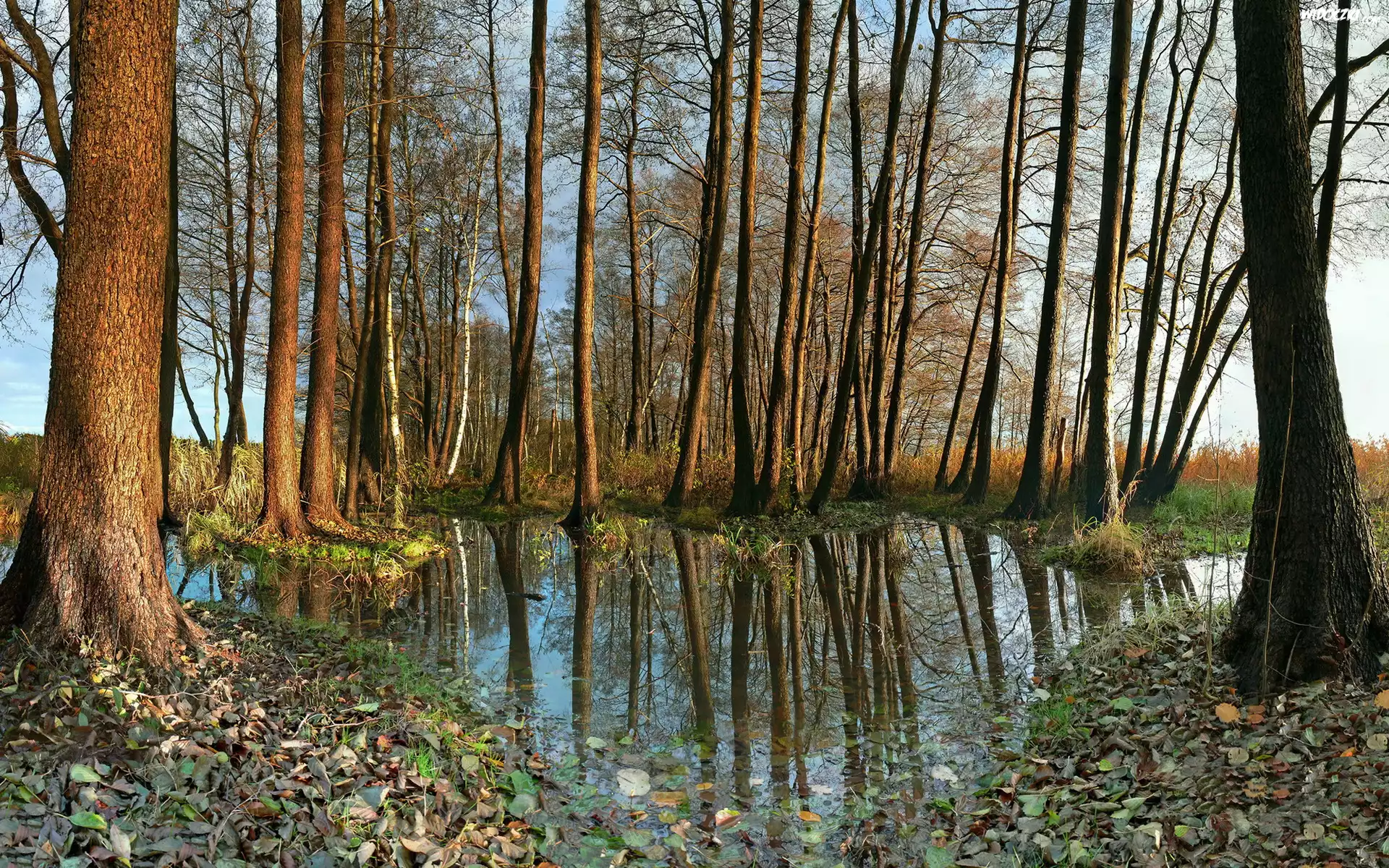 Woda, Drzewa, Liście, Jesień, Trawa, Odbicie