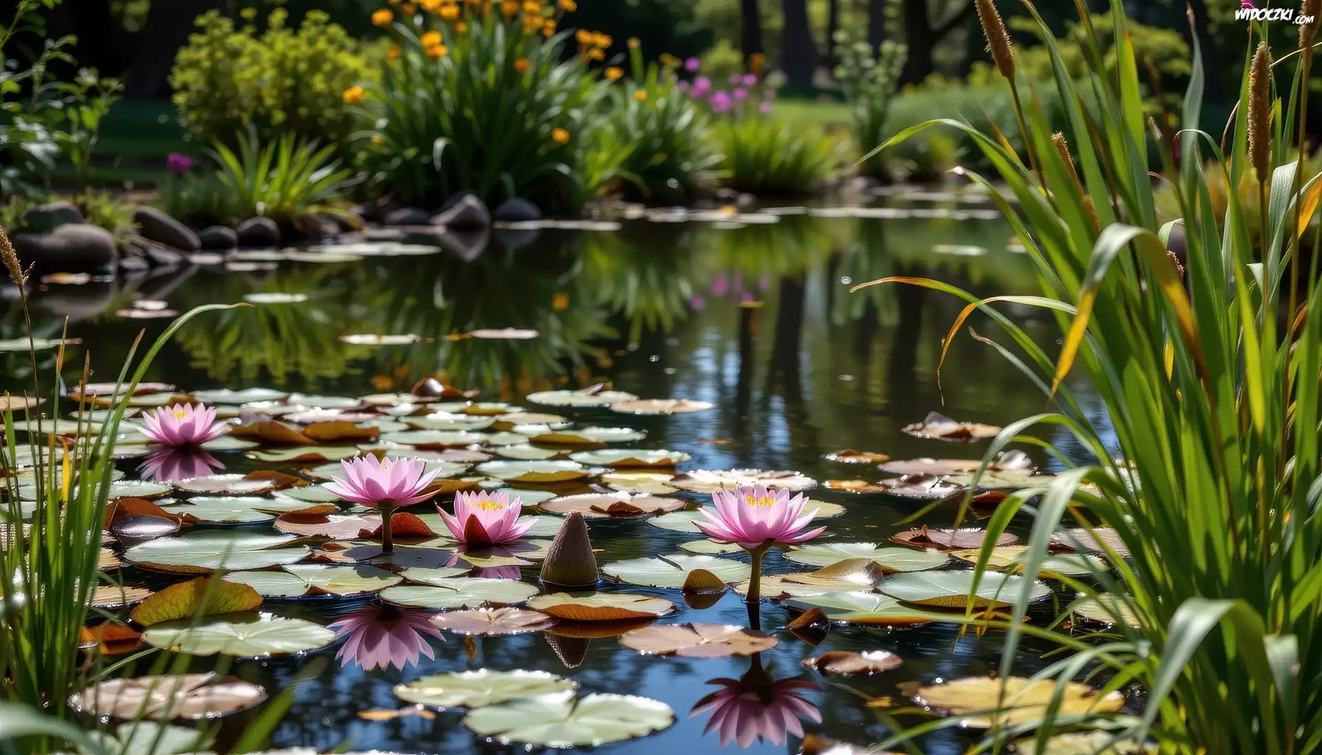 Zdj臋cia, Staw, Trzciny, Lilia wodna, Kwiaty, Grafika