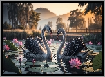 Zdjęcia, Łabędzie, Staw, Lilie wodne, Grafika AI