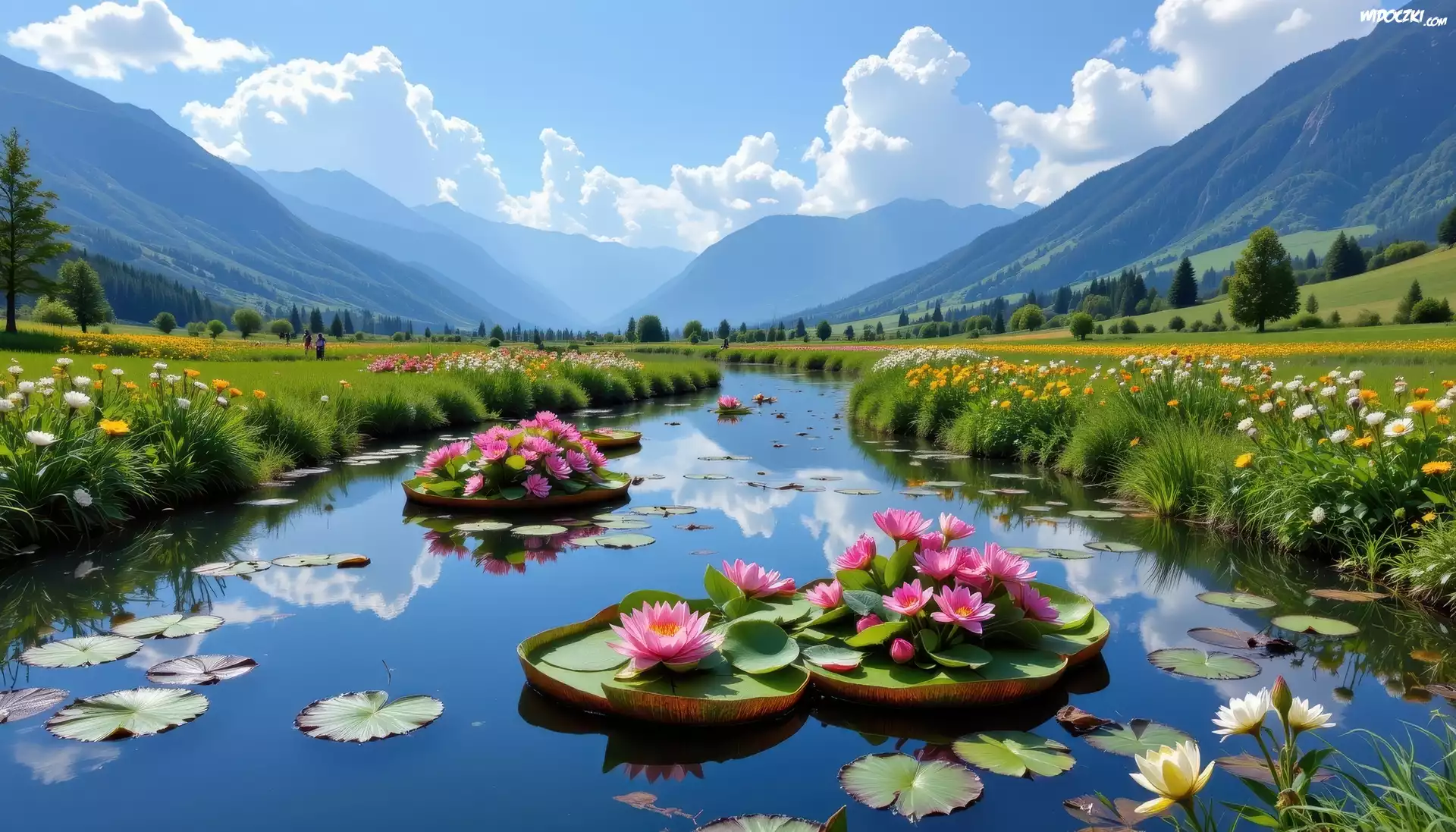 Zdjęcia, Rzeczka, Kwiaty, Lilie wodne, Liście, Góry