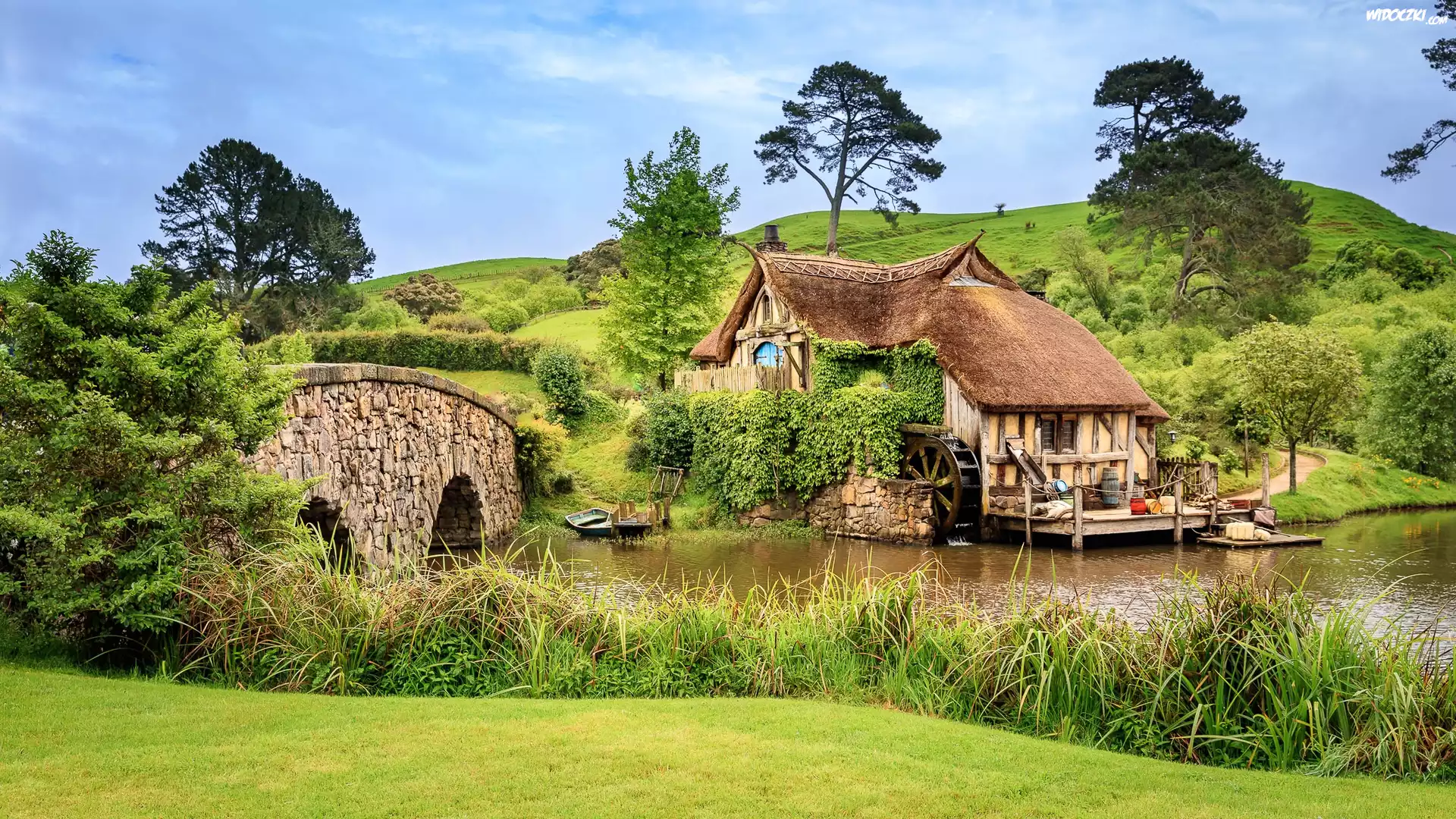 Zdjęcia, Młyn wodny, Rzeka, Kamienny, Most, Wzgórza, Drzewa