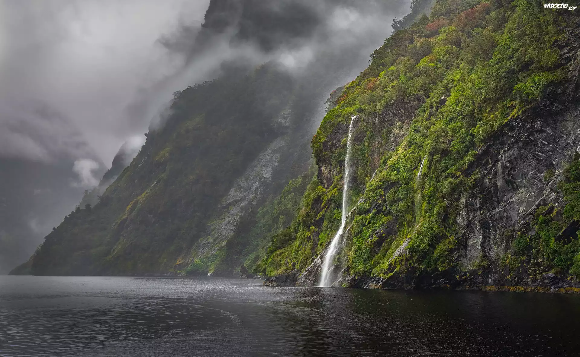 Zdjęcia, Góry, Mgła, Wodospad, Fiord, Doubtful Sound, Park Narodowy Fiordland, Nowa Zelandia