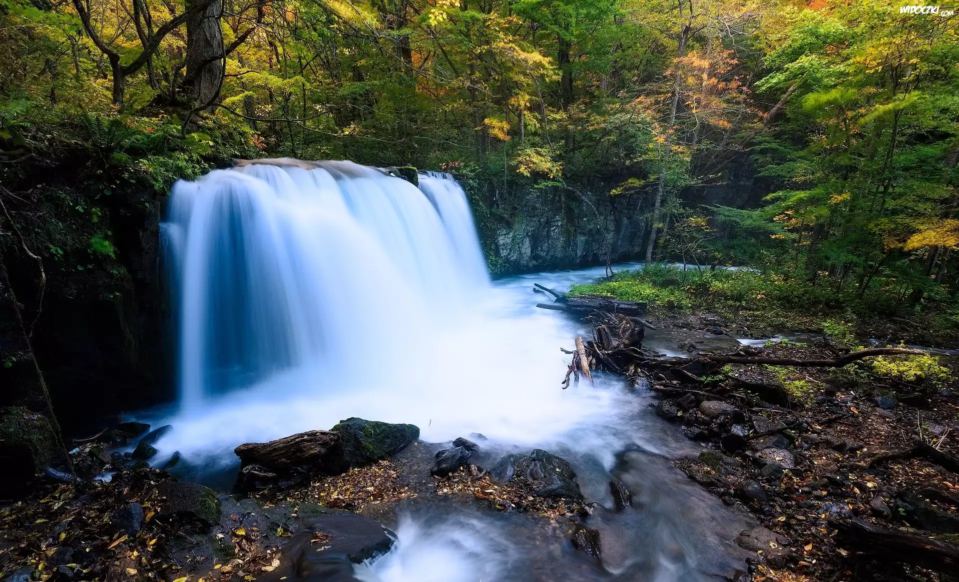 Wodospad, Jesień, Drzewa, Liście