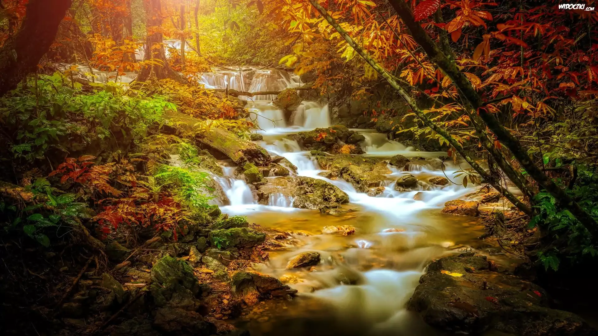 Zdjęcia, Wodospad, Kaskadowy, Kamienie, Las, Drzewa, Jesień