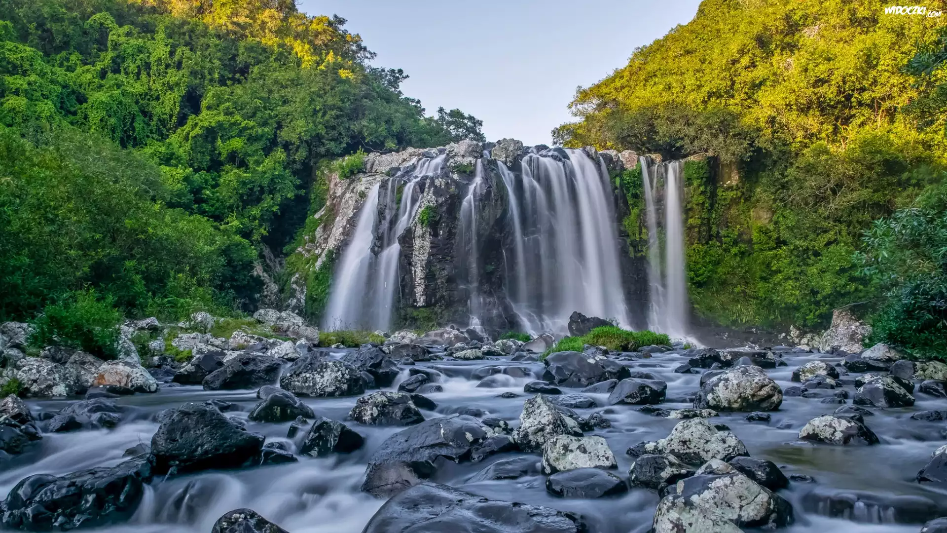 Zdjęcia, Wodospad, Kamienie, Drzewa, Roślinność