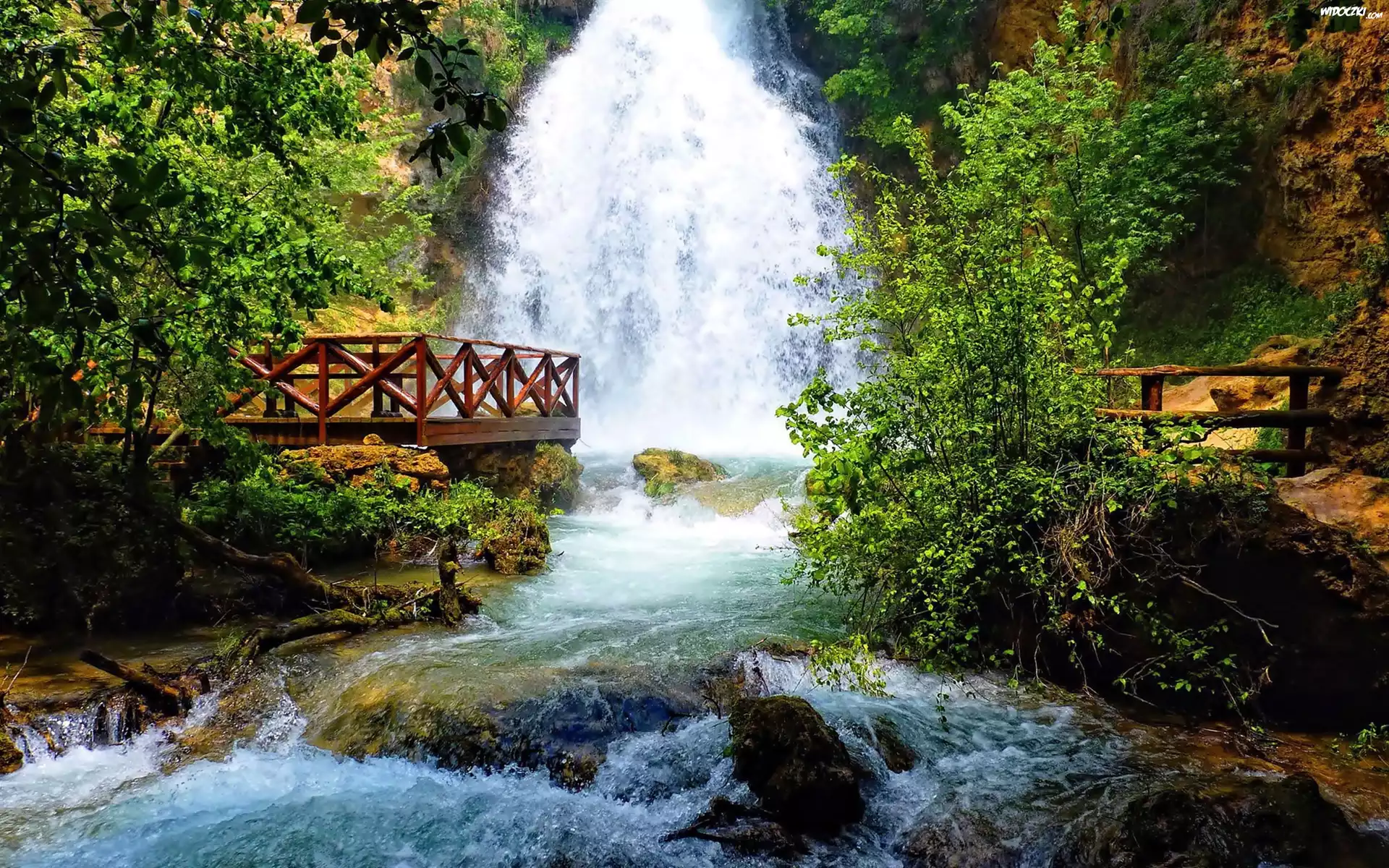 Wodospad, Rzeka, Kamienie, Drzewa, Pomost