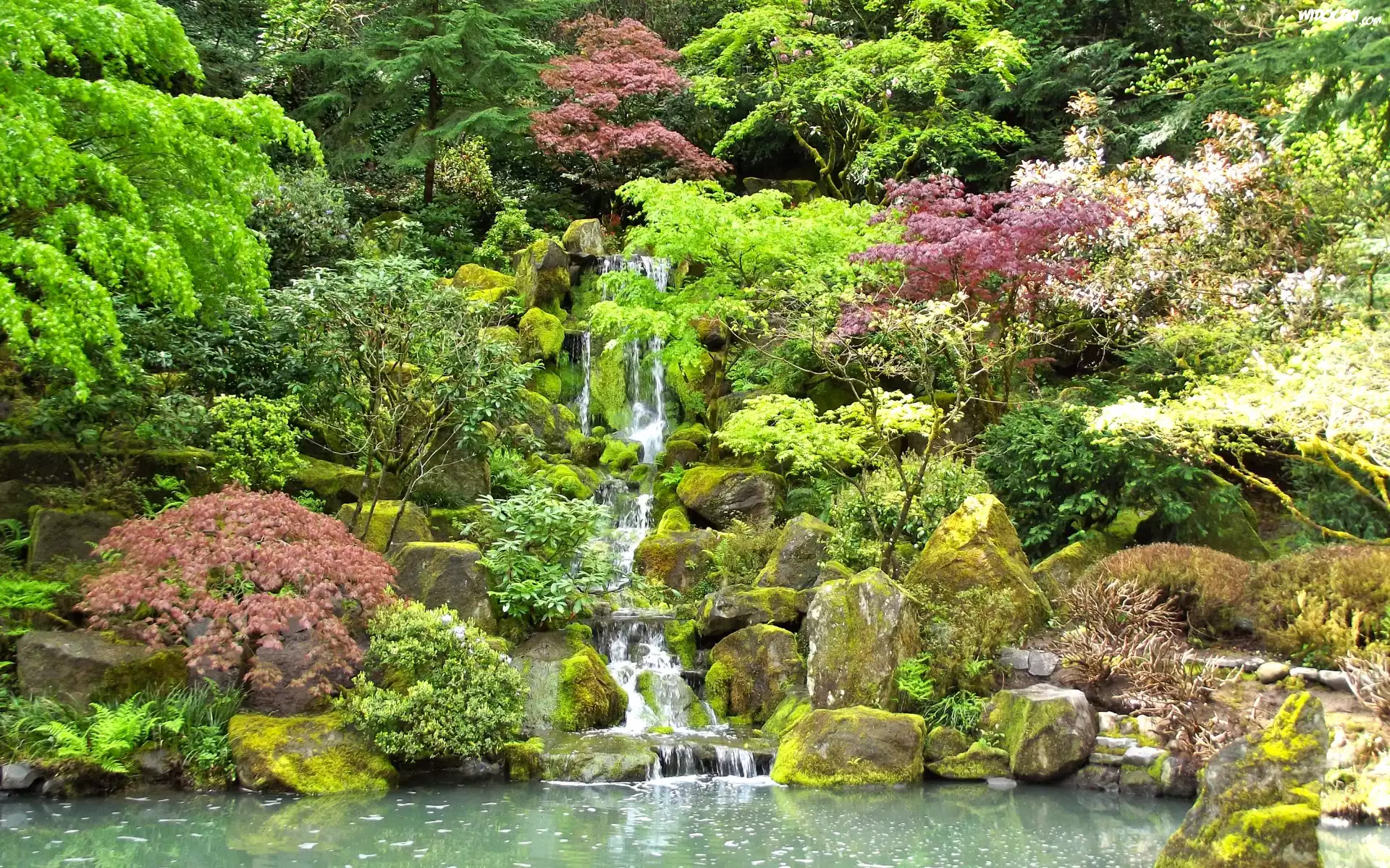 Zdjęcia, Wodospad, Strumyk, Kwiaty, Drzewa, Ogród