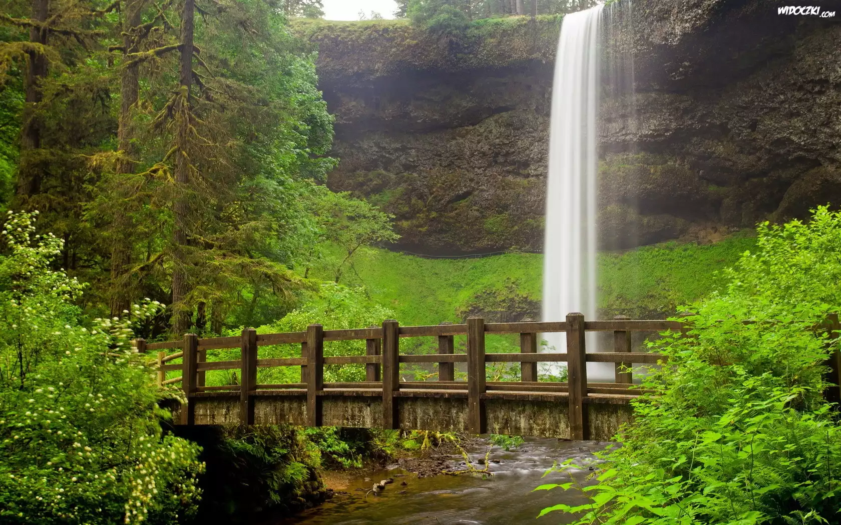 Zdjęcia, Wodospad, Mostek, Drzewa, Rzeczka