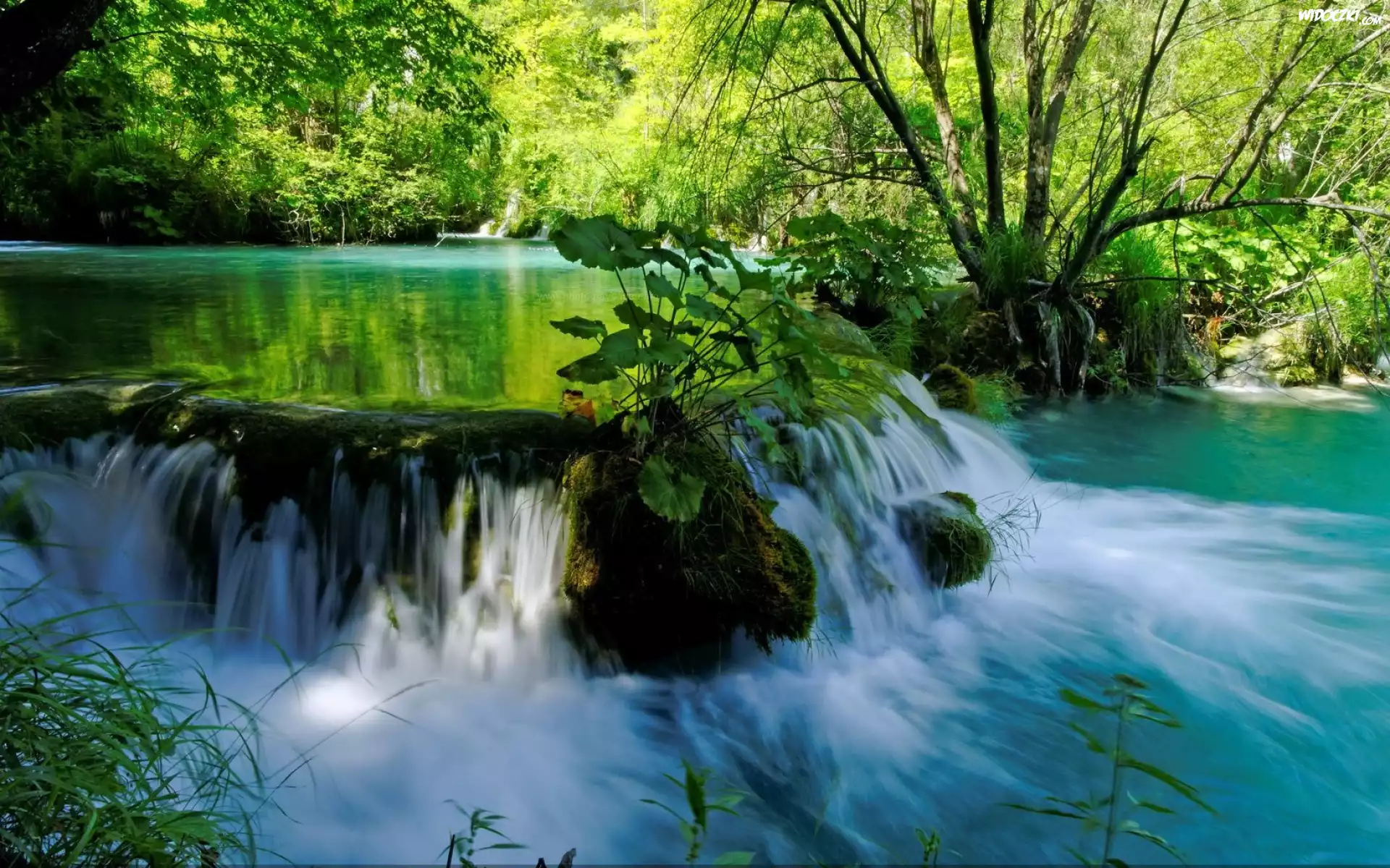 Zdjęcia, Wodospad, Park, Drzewa, Krzewy
