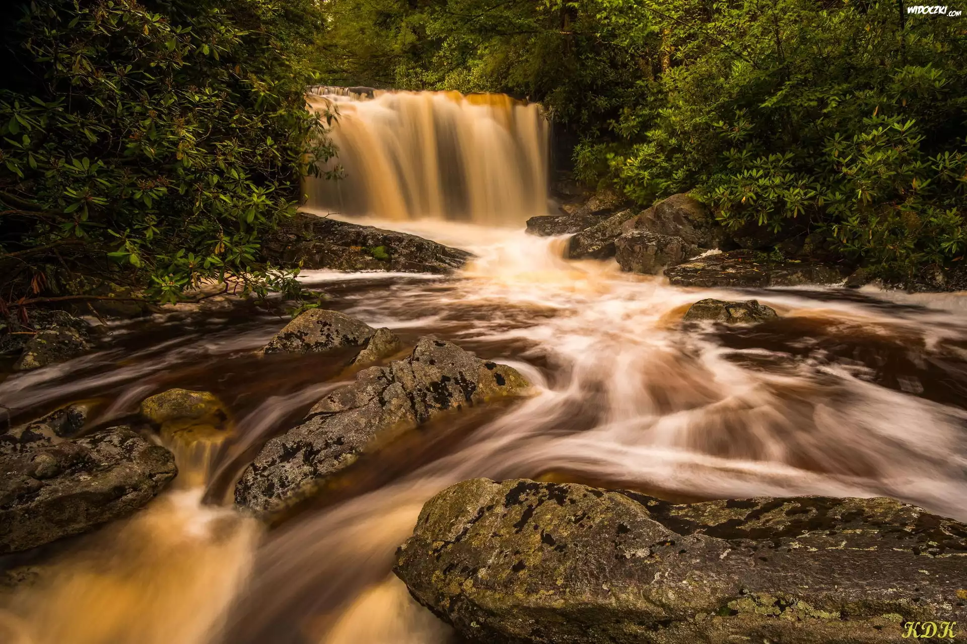 Zdjęcia, Wodospad, Skałki, Drzewa, Kamienie