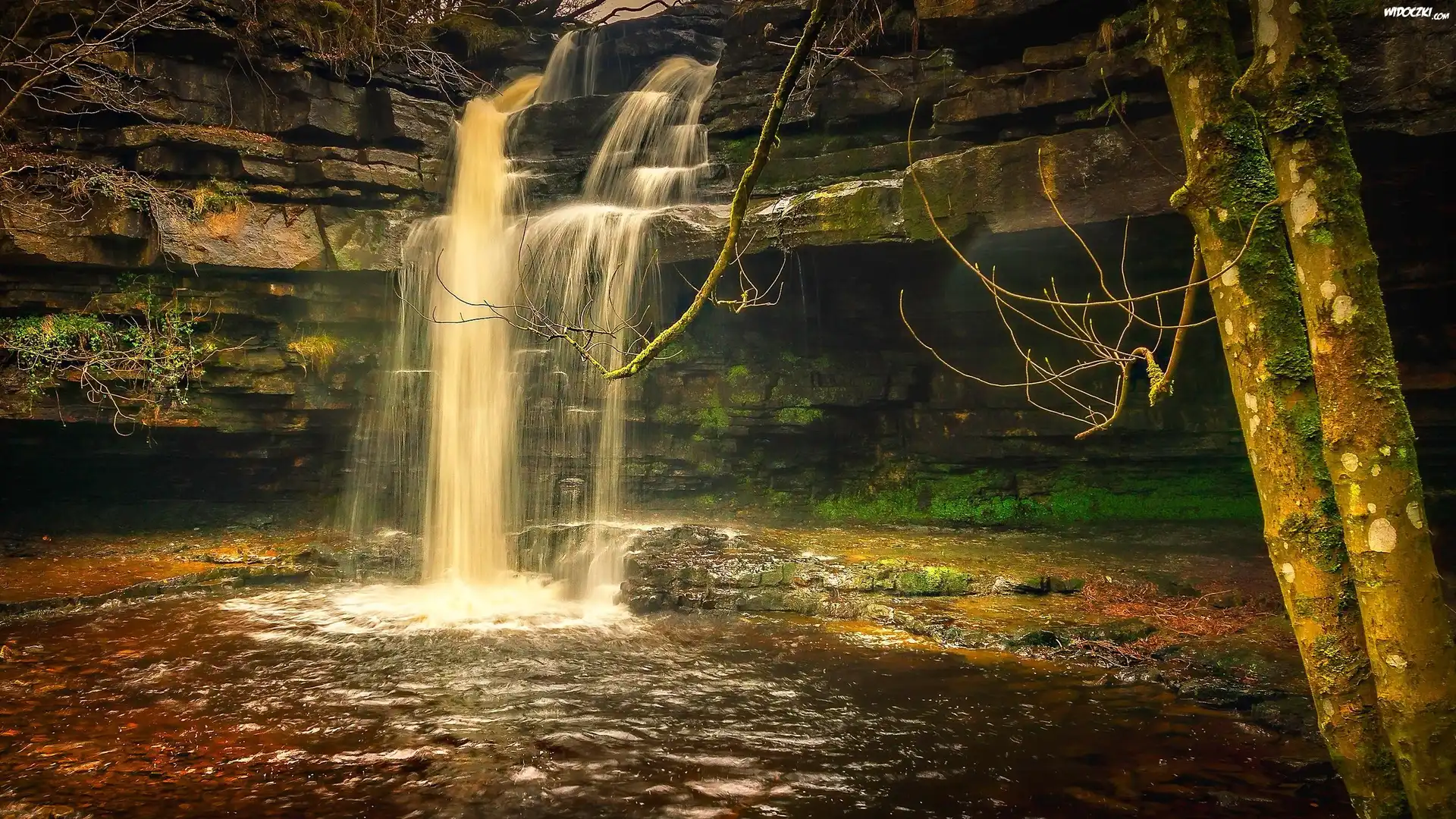 Zdjęcia, Wodospad, Skały, Drzewa, Gałęzie