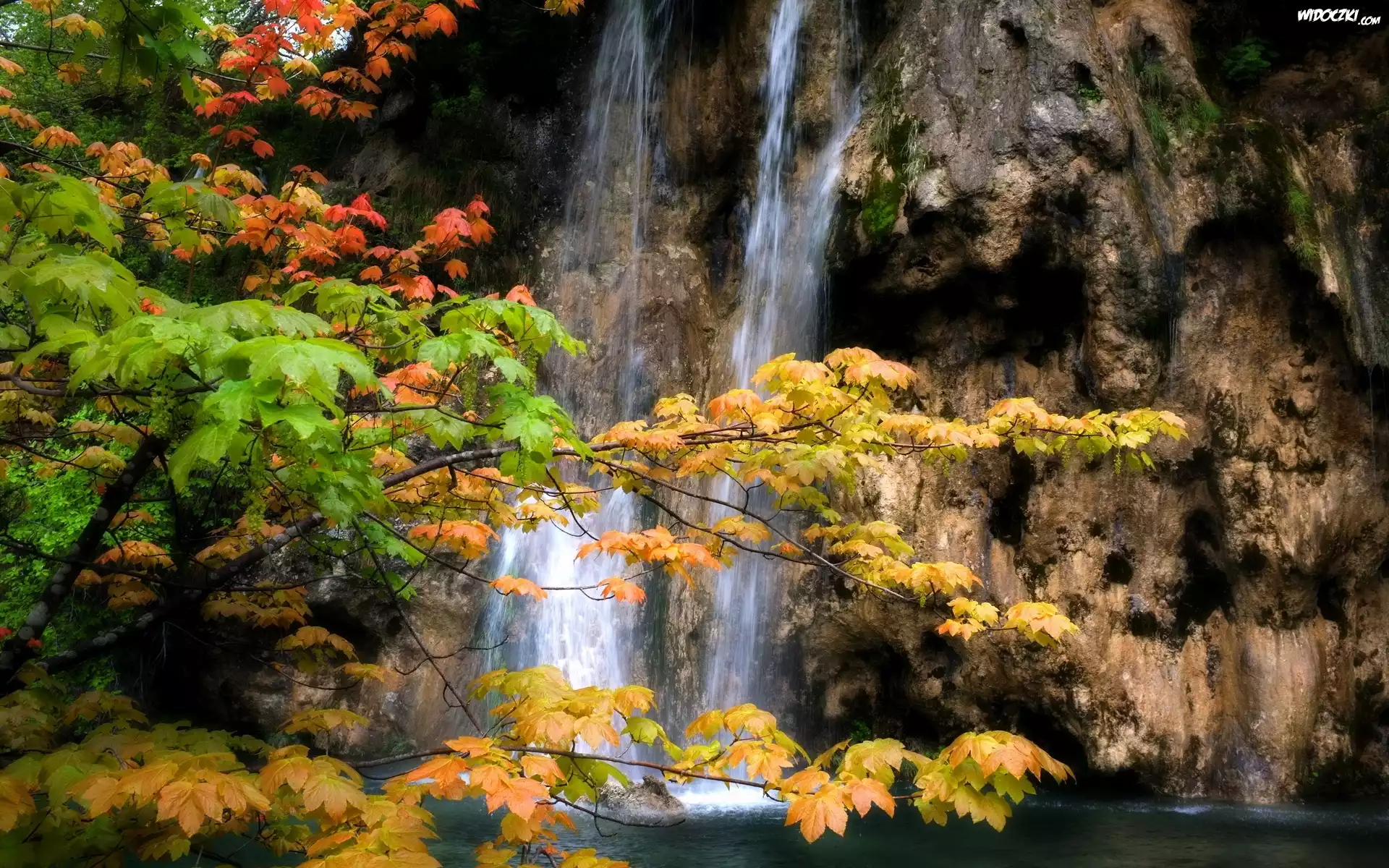 Zdjęcia, Wodospad, Skały, Drzewa, Jesień