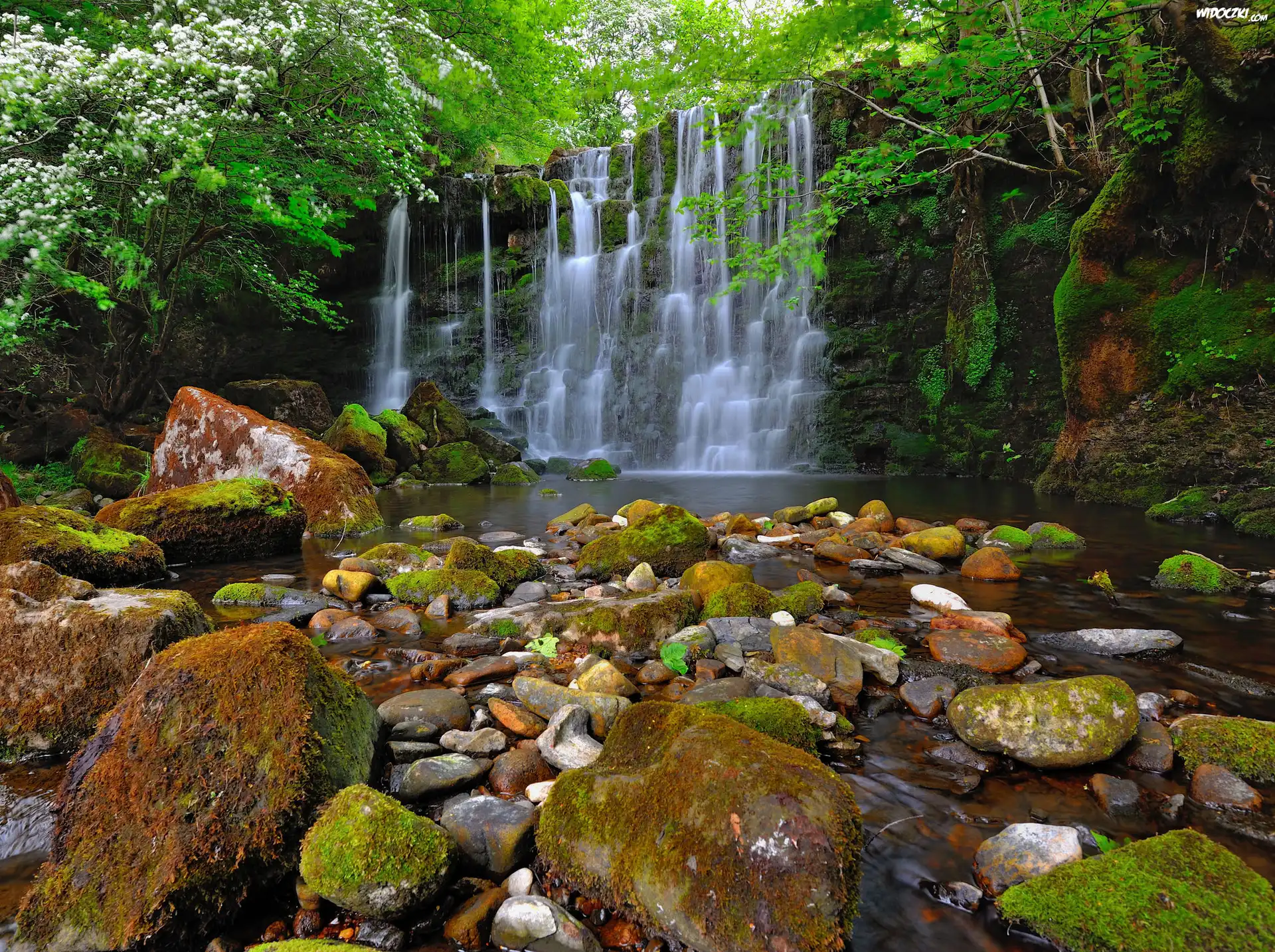 Wodospad, Skały, Zarośla, Drzewa, Kamienie