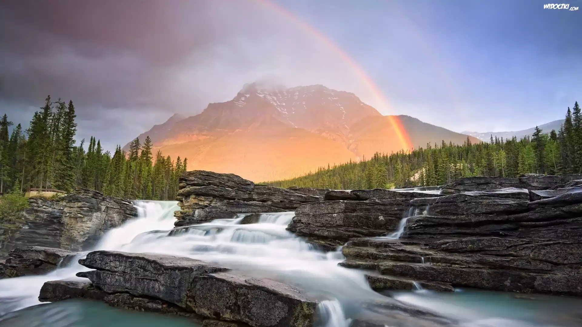 Zdjęcia, Wodospad, Skały, Las, Góry, Tęcza