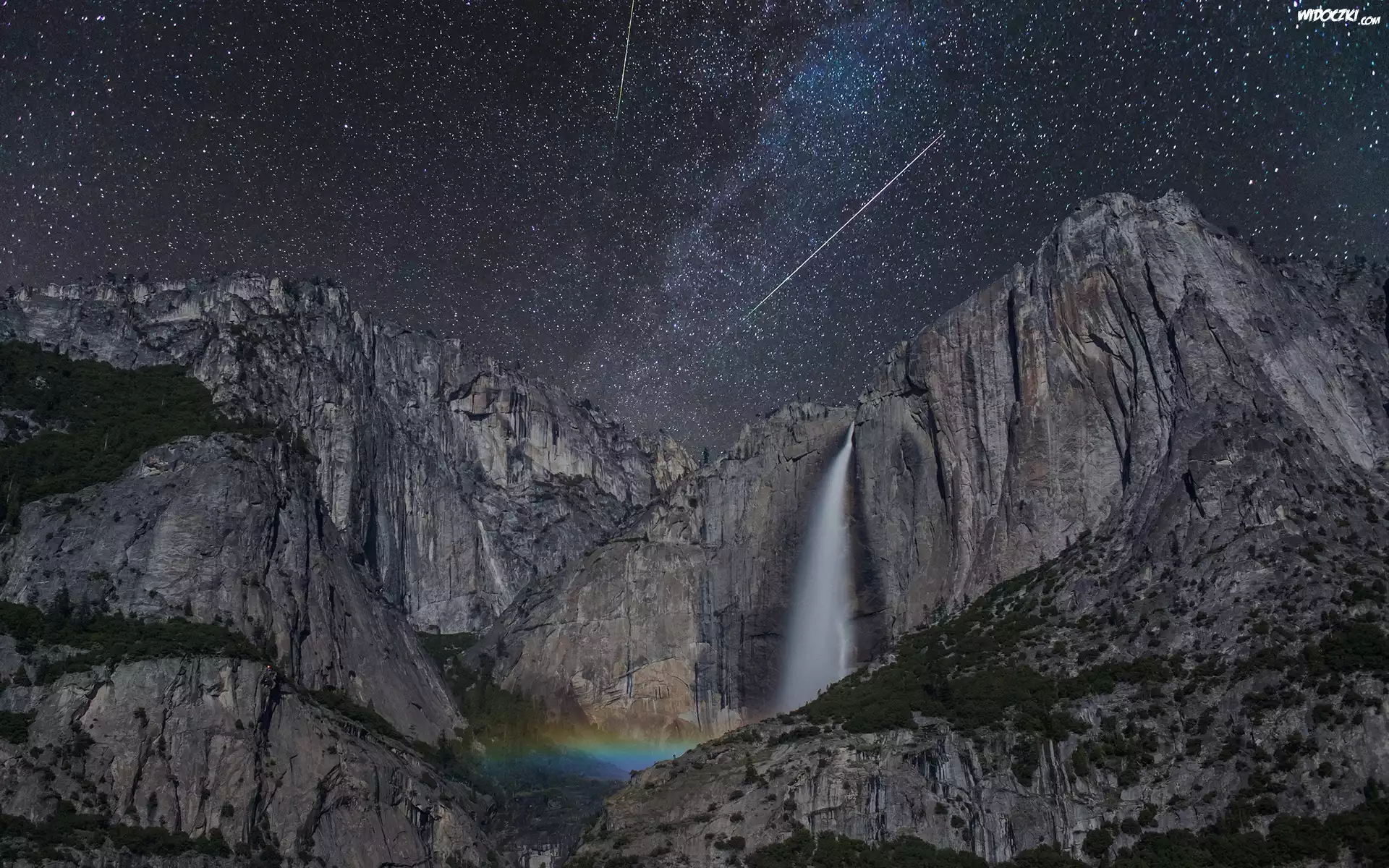 Zdjęcia, Wodospad, Noc, Góry, Gwiazdy